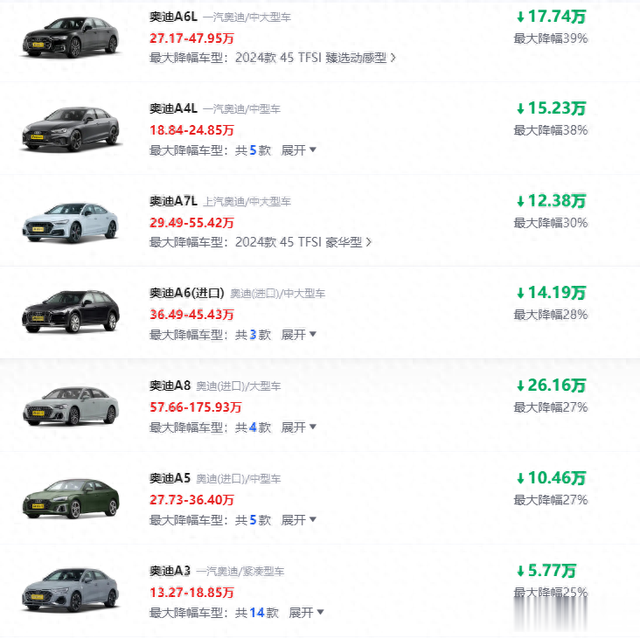 无论是奔驰还是宝马或者是奥迪,在市场中其普遍市场知名度、认可度都非常高,一直被绝大多数都信奉为高端品牌。即便当前的市场,依然市场中是很多朋友这么认为的,奥迪随着市场压力加大以及国产自主品牌崛起政策的倾斜,如今奥迪系列的车型,虽然依然霸占市场高端品牌定位。但是如今的性价比,已经不是曾经的性价比,今天给大家来看一下,奥迪旗下多款家用轿车,目前的市场行情。