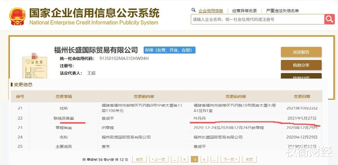 据国家企业信用网上,找到了更确切的信息,叶丹丹2021年5月27日福州长盛国际贸易有限公司变更信息出现过,备案为公司的联络员。