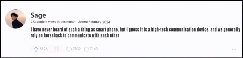 另一位网友接着回答:完全没听过智能手机这种东西,不过我猜它是一个高科技的通讯设备。我们这里通讯一般靠骑马去告知对方。 紧接着又有网友回应:我们这里就比较惨了,我们没有马,都是靠信鸽来传递信息。
