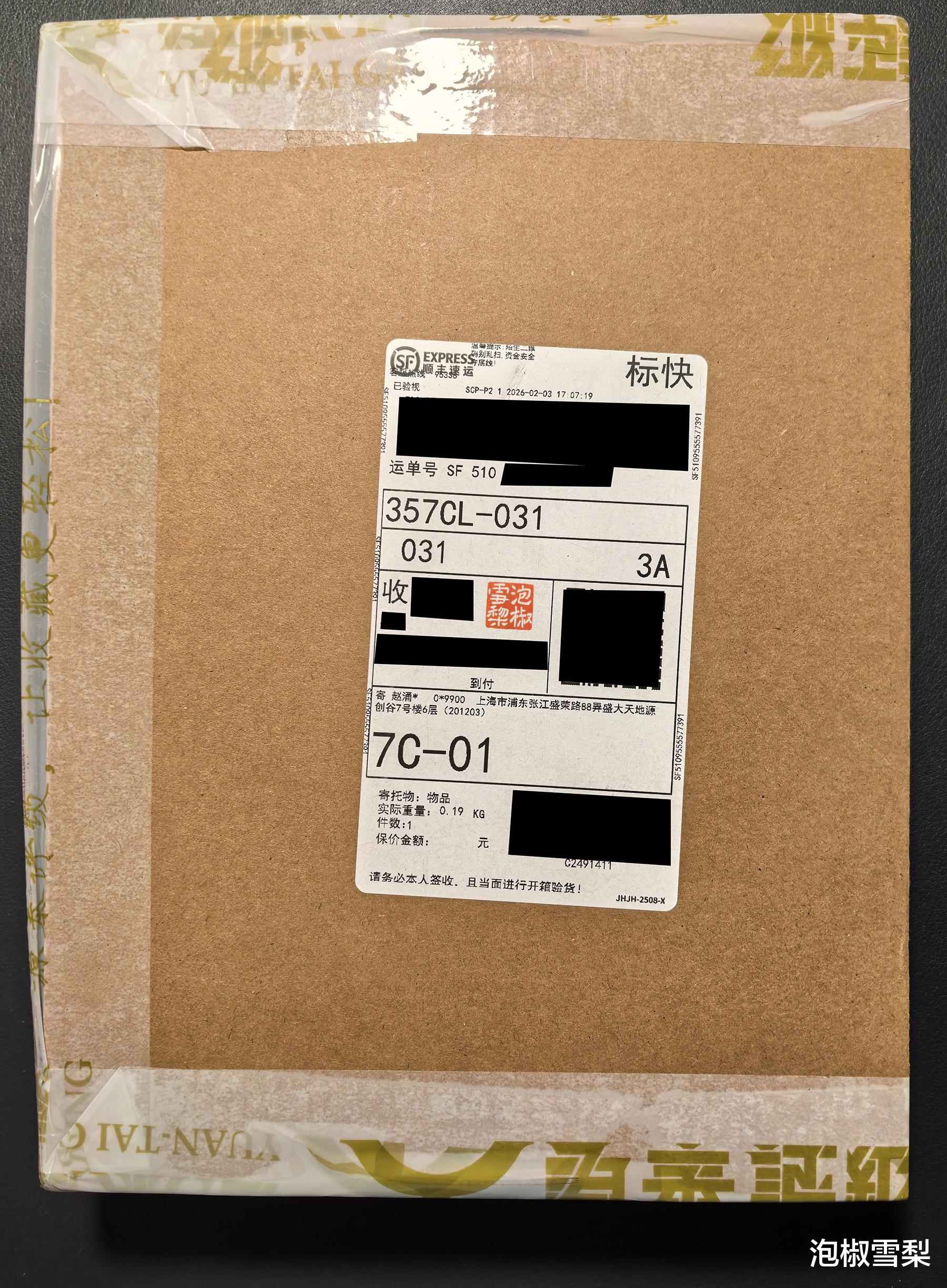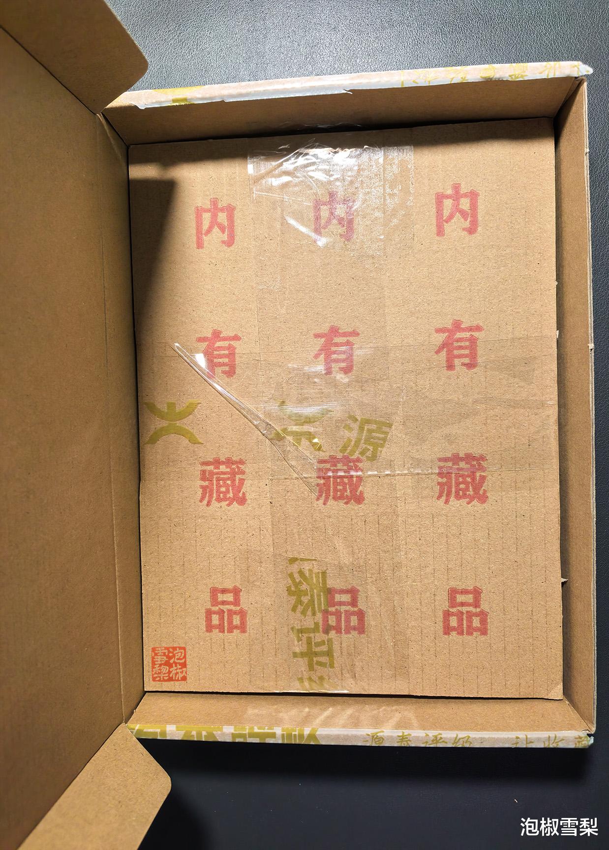 发货单下就是藏品了,藏品由两张瓦楞纸板夹住,宽胶带十字交叉密封,纸板上印着“内有藏品”字样,防止买家误扔。