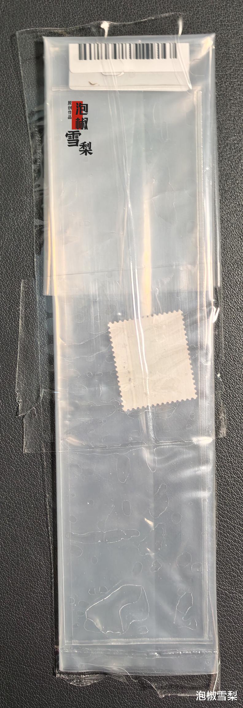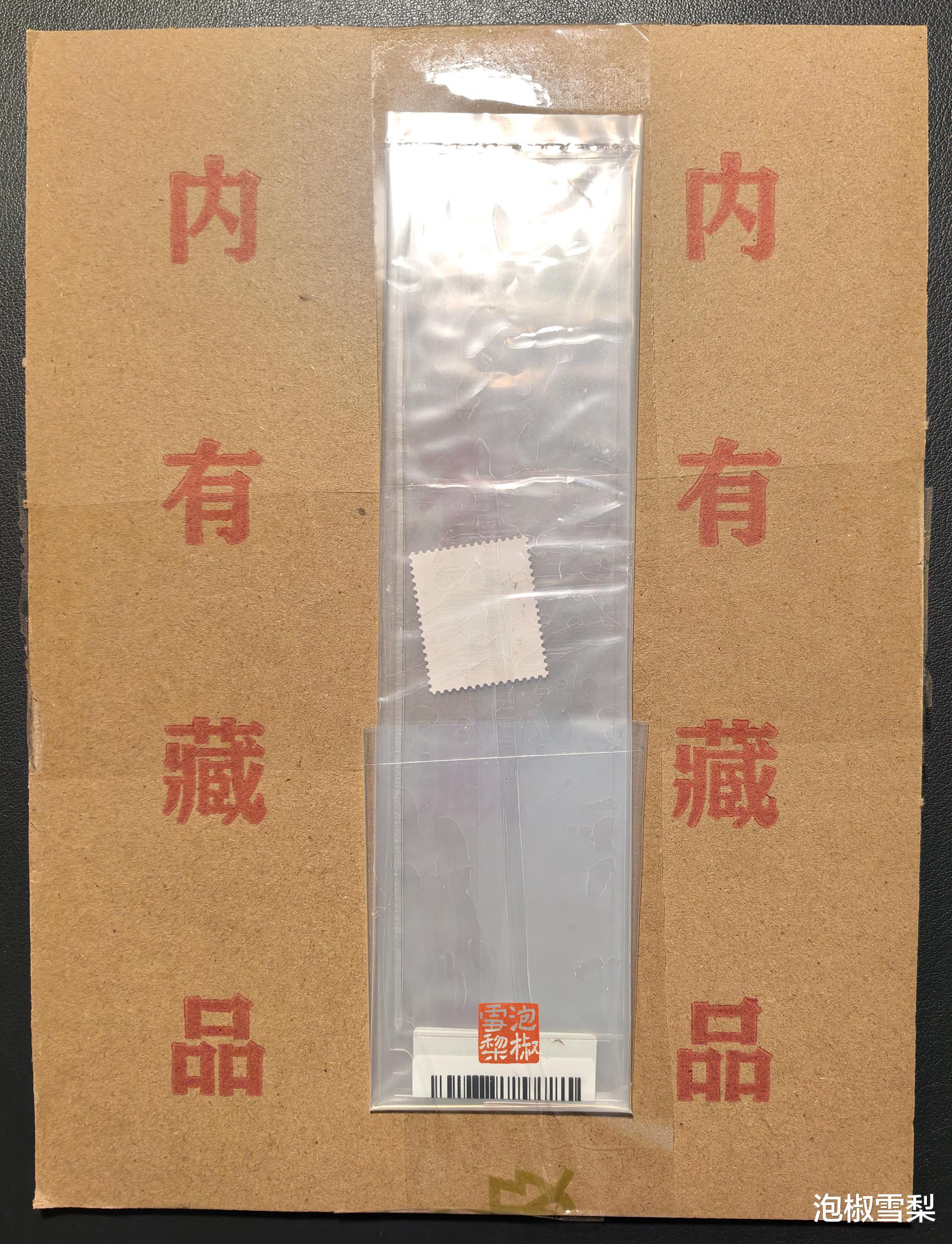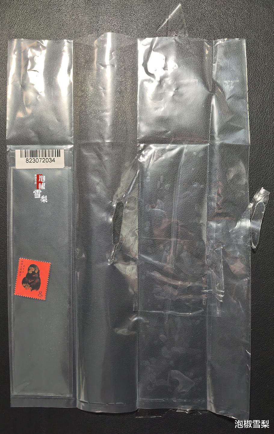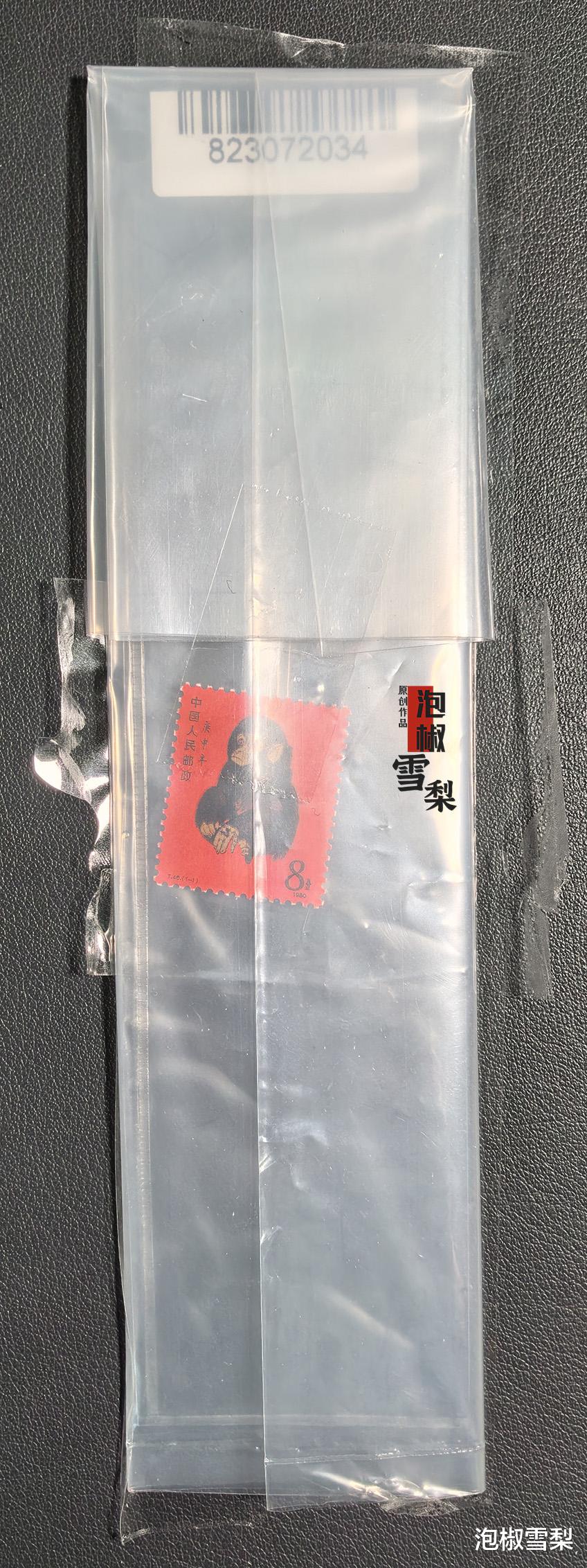 取下胶带后,可以看到猴票在半透明塑料袋内存放,可以摸到其中有硬塑料固定夹条。