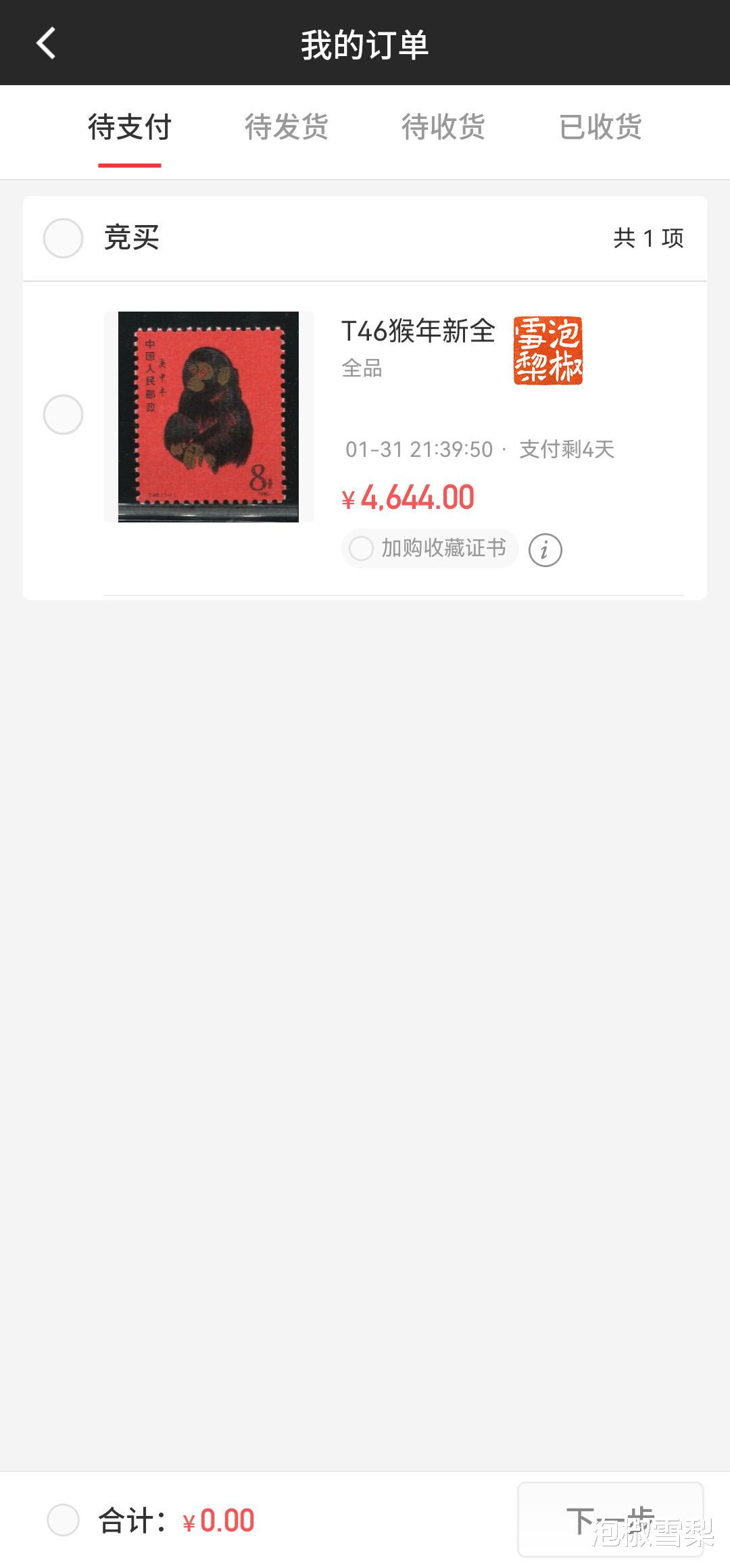 截标后,在我的订单中生成了一笔“待支付”订单,打开后就能看到刚才购买的猴票了。