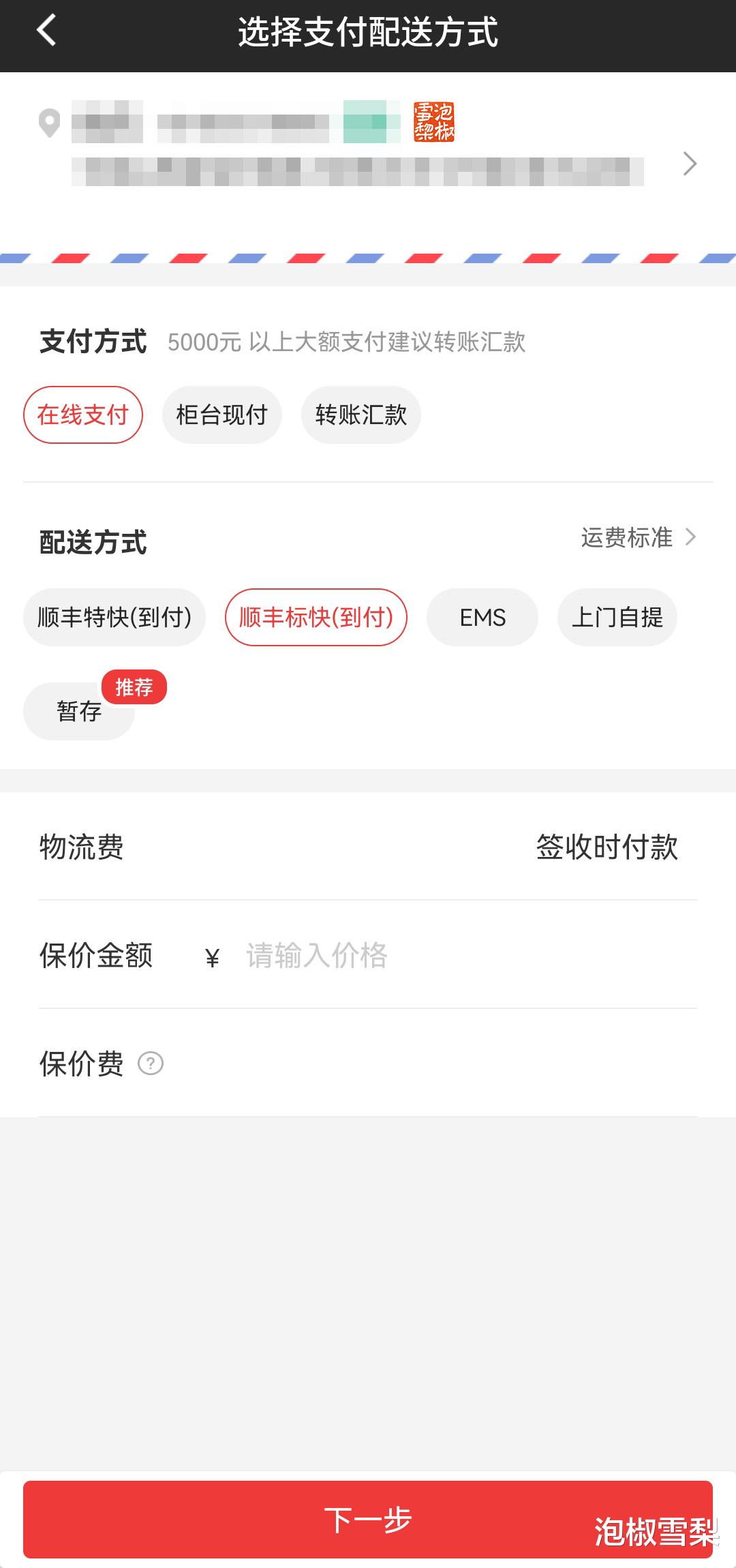 点击下一步,可以选择收货地址、支付方式以及配送方式,虽然是价格很高的藏品,但平台没有包邮选项,较贵的藏品还可以增加保价。