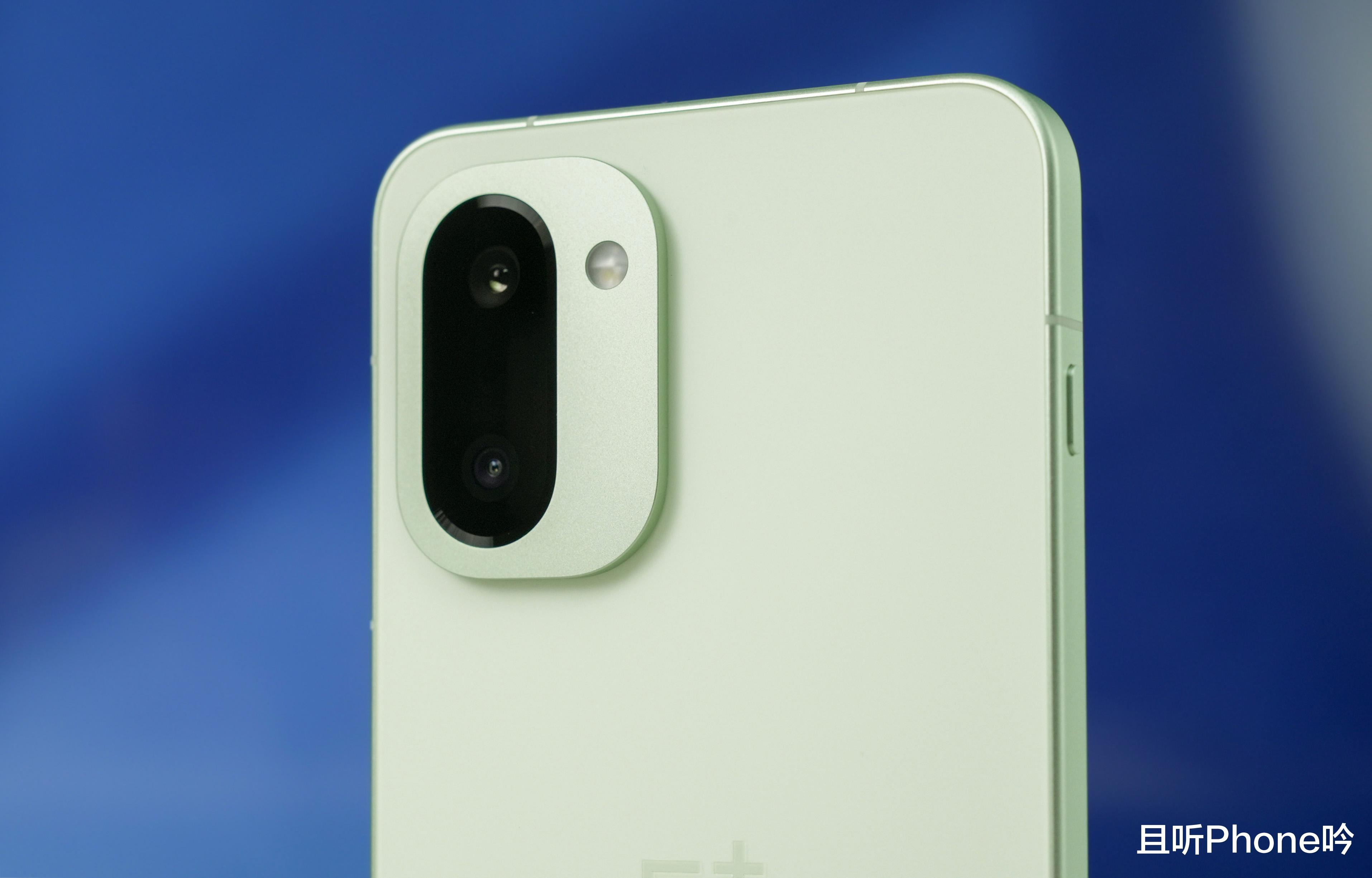 材质上也有说法,「丝绸玻璃工艺」手感真是绝绝子,相比普通磨砂玻璃触感更细腻,而且不沾指纹。旗舰同款铝金属中框,磨砂处理,并同样做成了绿色,整机的观感和触感都非常统一。