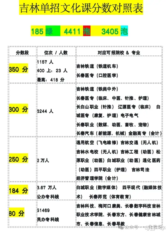 第一个,文化课184分, 去年,全省公办学校投放3.67 万个计划,对应的文化课分数就是 184 分。这个分数段能冲公办专科,比如白城职业技术学院的数字媒体专业、四平现代职业技术学院的融媒体技术专业、长春师范高等专科学校的体育教育专业,都是公办院校里适配这个分数的优质选择。