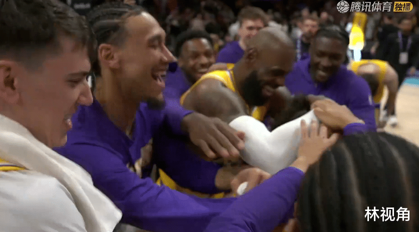 比赛结束,湖人球员围住东契奇一起激情庆祝,老詹带头摁住东契奇,大家一起乱拍,场面很是热闹。