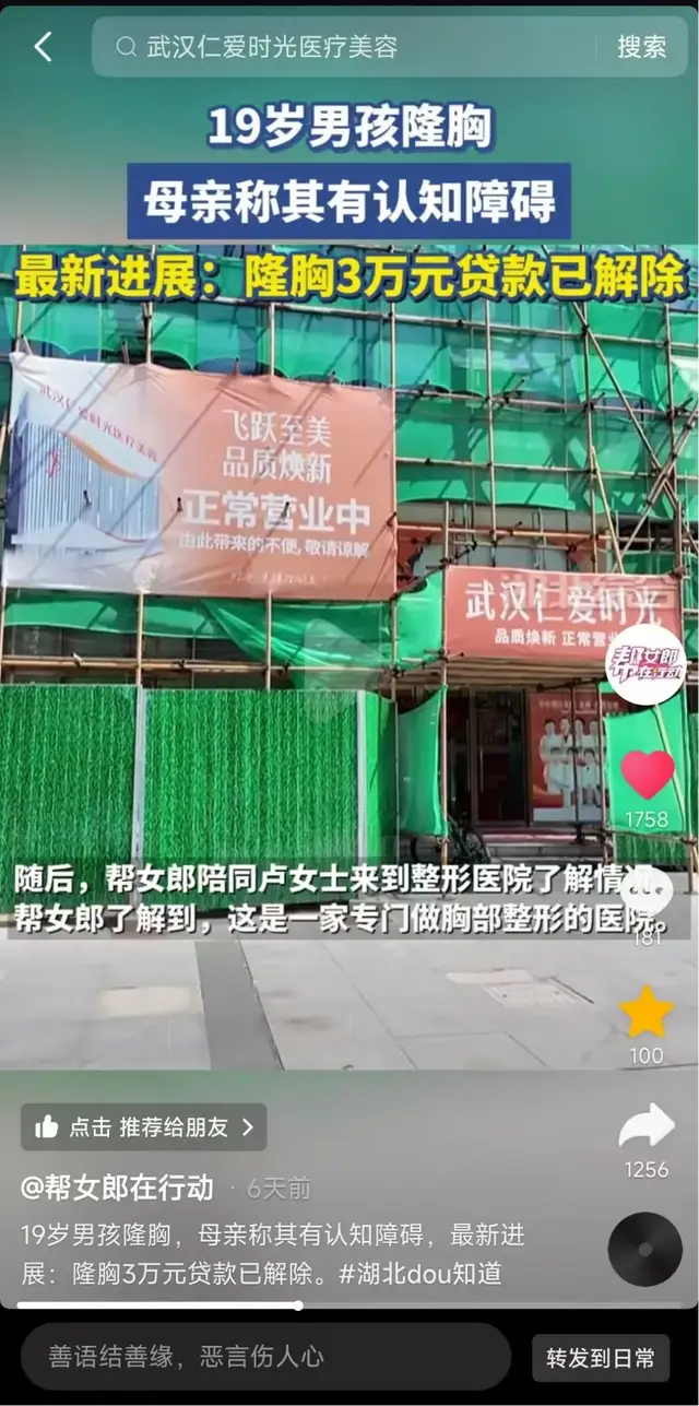 8月7日,@帮女郎在行动(湖北电视台综合频道旗下新闻节目)在抖音发布视频:一位卢姓母亲表示,在其不知情的情况下,19岁儿子于7月28日做了隆胸手术,换药时看到大概B罩杯样子,家人知道这个事情以后非常震惊,像天要塌下来一样。