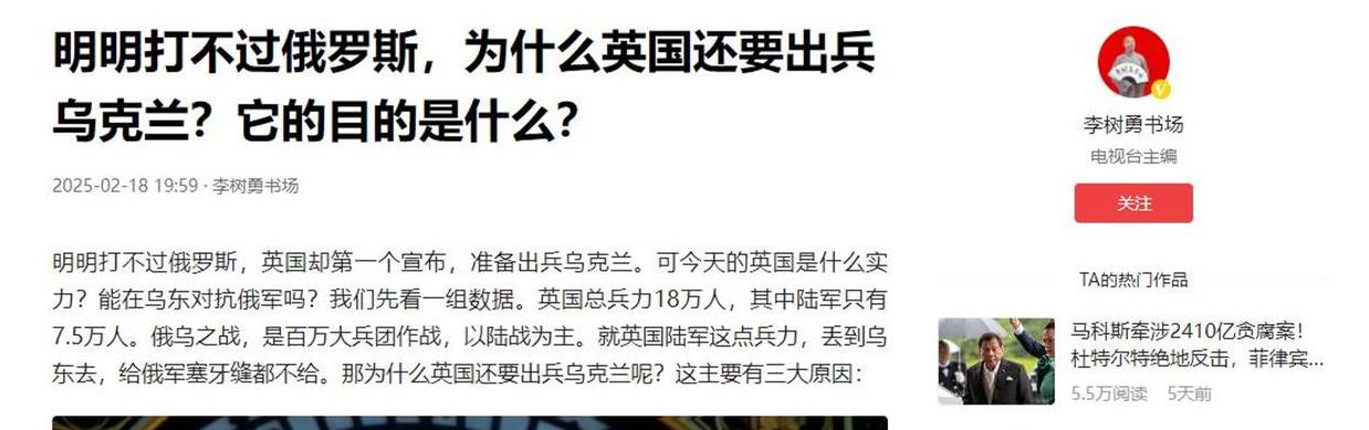英国为何出兵乌克兰明明打不过俄罗斯,英国干嘛还要去乌克兰出兵呢?他们到底想干啥? 李树勇书场这种情况下,英国明知打不过俄罗斯,为啥还要跑到乌克兰去掺和呢?他们到底有什么目的?
