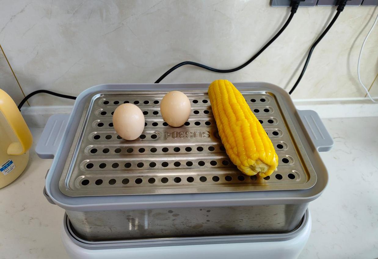 小笼包,玉米和鸡蛋分别放进电蒸锅的两层,一起蒸15分钟。