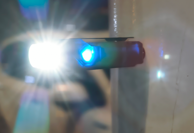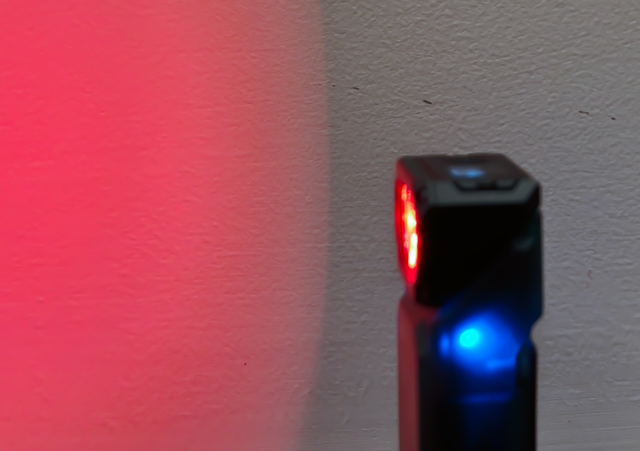 红光,用的是流明纳斯家的SST10,亮度最高可达80流明,完全可以用作氛围灯和一些特殊场景使用比如说夜间钓鱼,搭配磁吸设计,可以说既方便又能驱蚊。另外,还可以打开闪烁模式用作SOS求救。