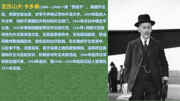 亚历山大·卡多根是丘吉尔在二战期间重要的外交助手,在“威尔士亲王”号战列舰上,他和丘吉尔梳理了会谈中可能出现的所有讨论点:关于英美战后意愿的宣言;参谋人员之间更紧密的合作;在《租借法案》许可范围内的具体军火需求等等。卡多根临时扮演了罗斯福的角色,这让丘吉尔可以预先准备和美国总统的辩论,也可以让他准备好如何应对罗斯福的答复。