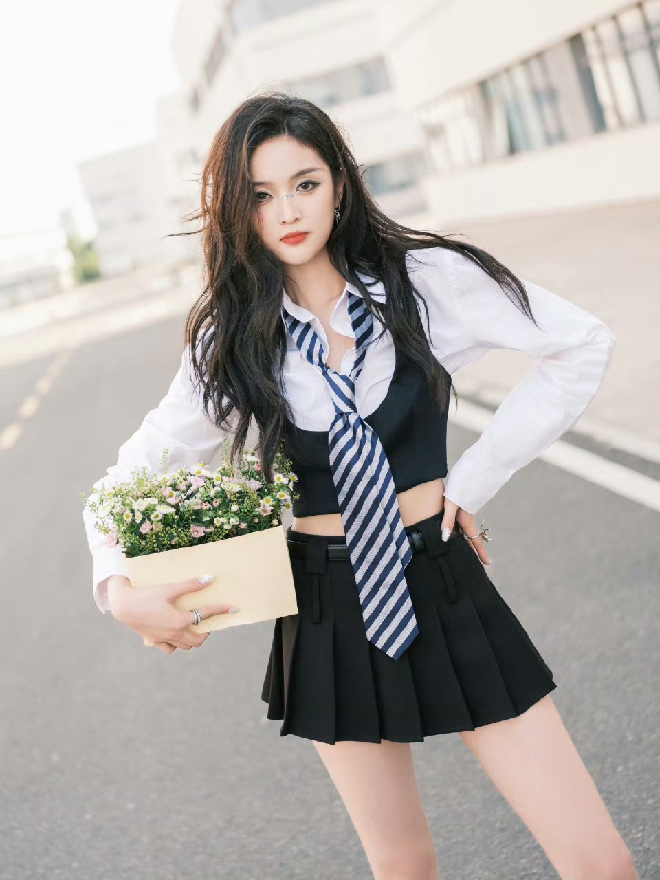 服饰是外在的载体,而吴宣仪的神态与肢体则让这份美有了鲜活的生命力。她手持花盒时,眉眼间带着温柔的笑意,发丝微卷的弧度与衬衫的褶皱相映成趣;单手叉腰时,肩膀微挺,眼神坚定又带着一丝狡黠,百褶裙的棱角与她的气场相融,勾勒出飒爽的轮廓;轻撩发丝的瞬间,指尖的戒指与耳饰的微光点缀其间,与服饰的黑白主调形成呼应,让整体造型的精致感层层递进。