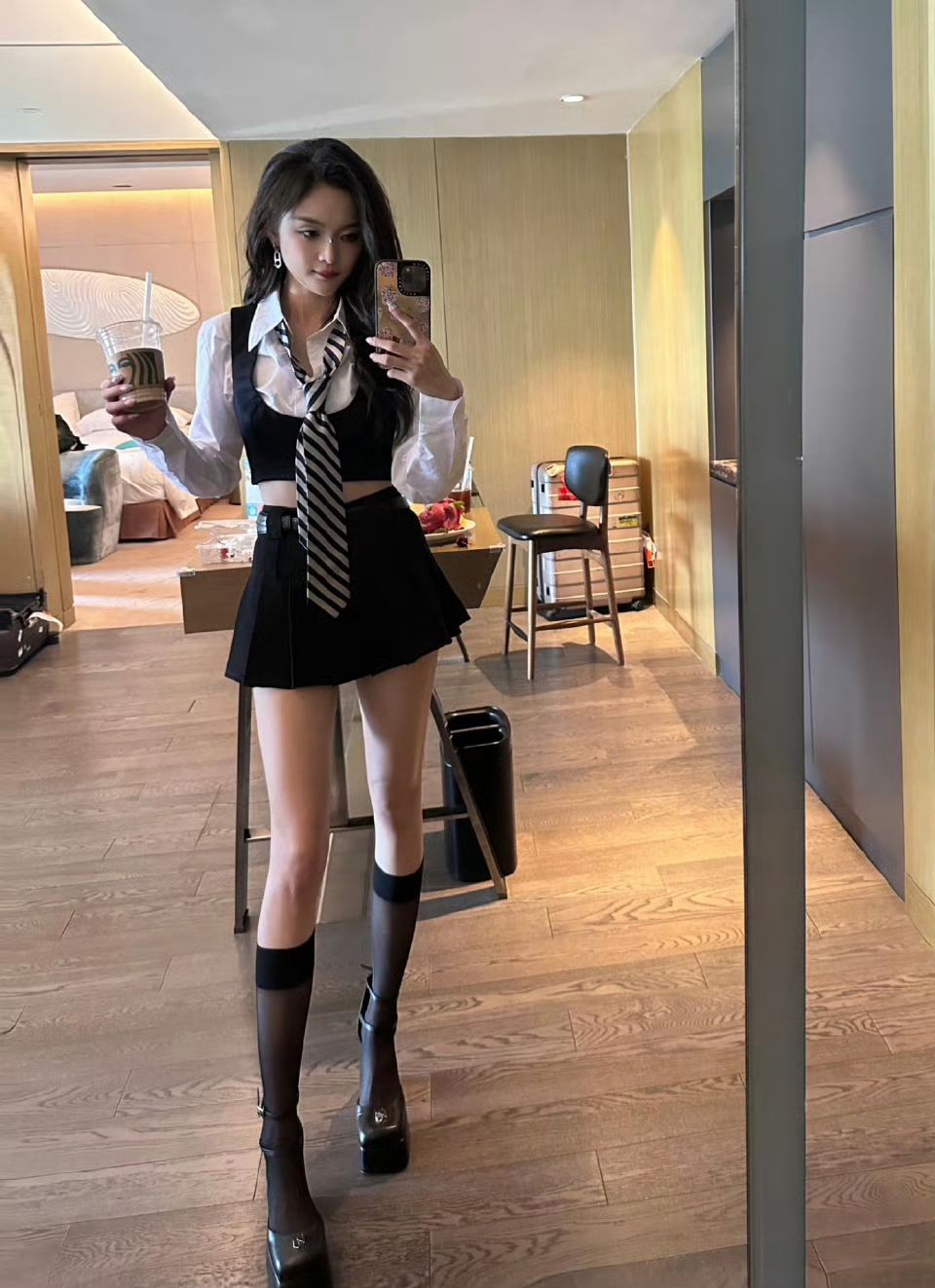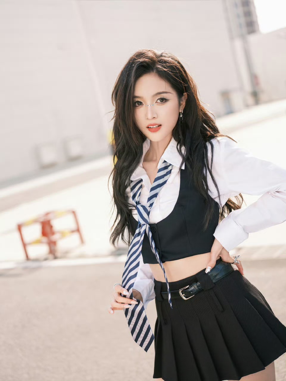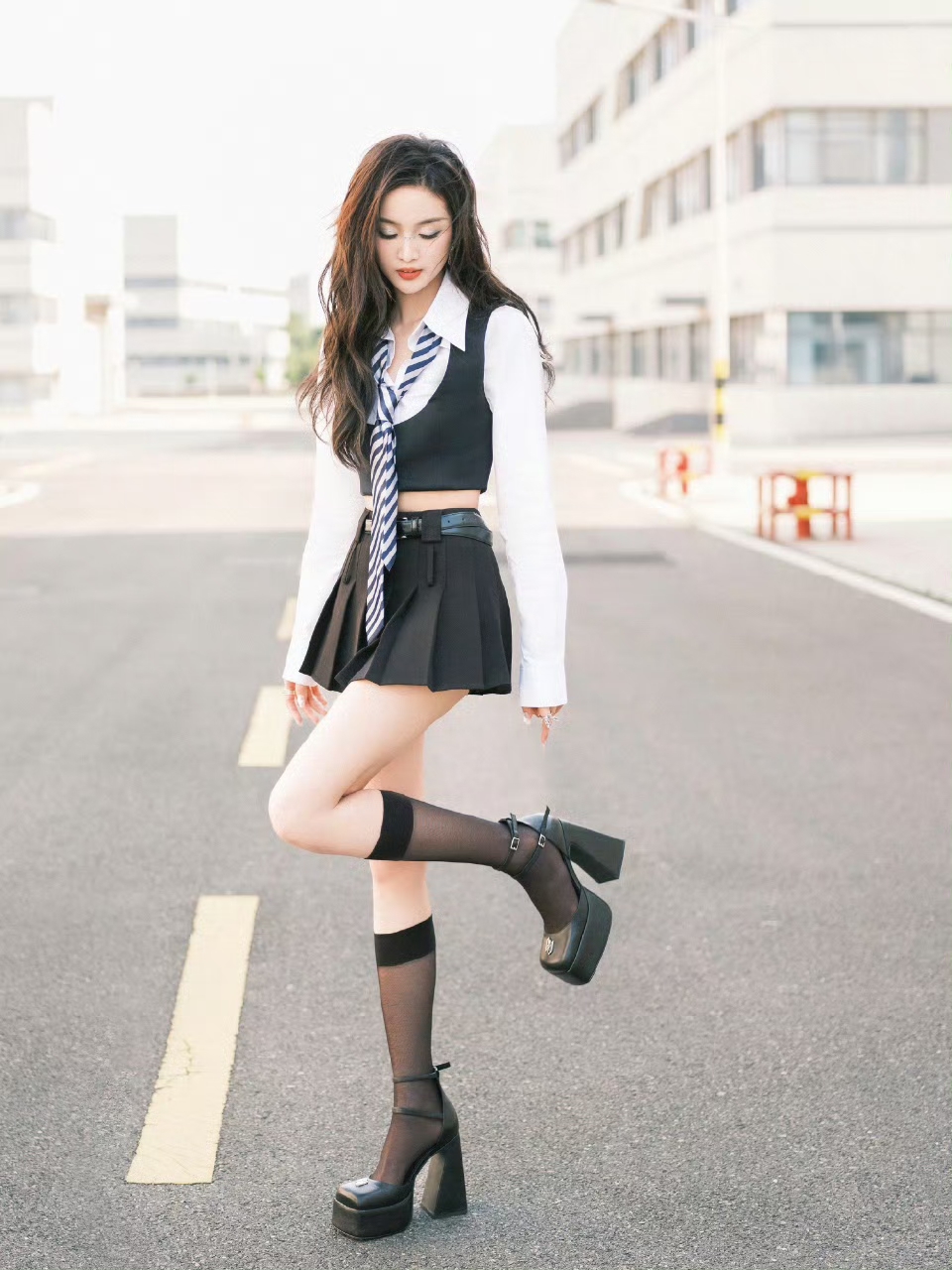 条纹领带与黑色百褶短裙的组合,是学院风的经典符号,却在吴宣仪身上被赋予了新的韵味。蓝白条纹领带没有规规矩矩地系好,而是随意垂落,一端搭在腰间,一端绕在指尖,为规整的学院风注入了灵动的俏皮;黑色百褶短裙的裙摆随着动作轻轻晃动,利落的褶皱纹理勾勒出腿部线条,搭配黑色中筒网袜与厚底皮鞋,甜酷的风格反差瞬间拉满。这些服饰细节的巧思,让学院风不再是单一的“学生气”,而是融合了时尚感与个性表达的穿搭语言。