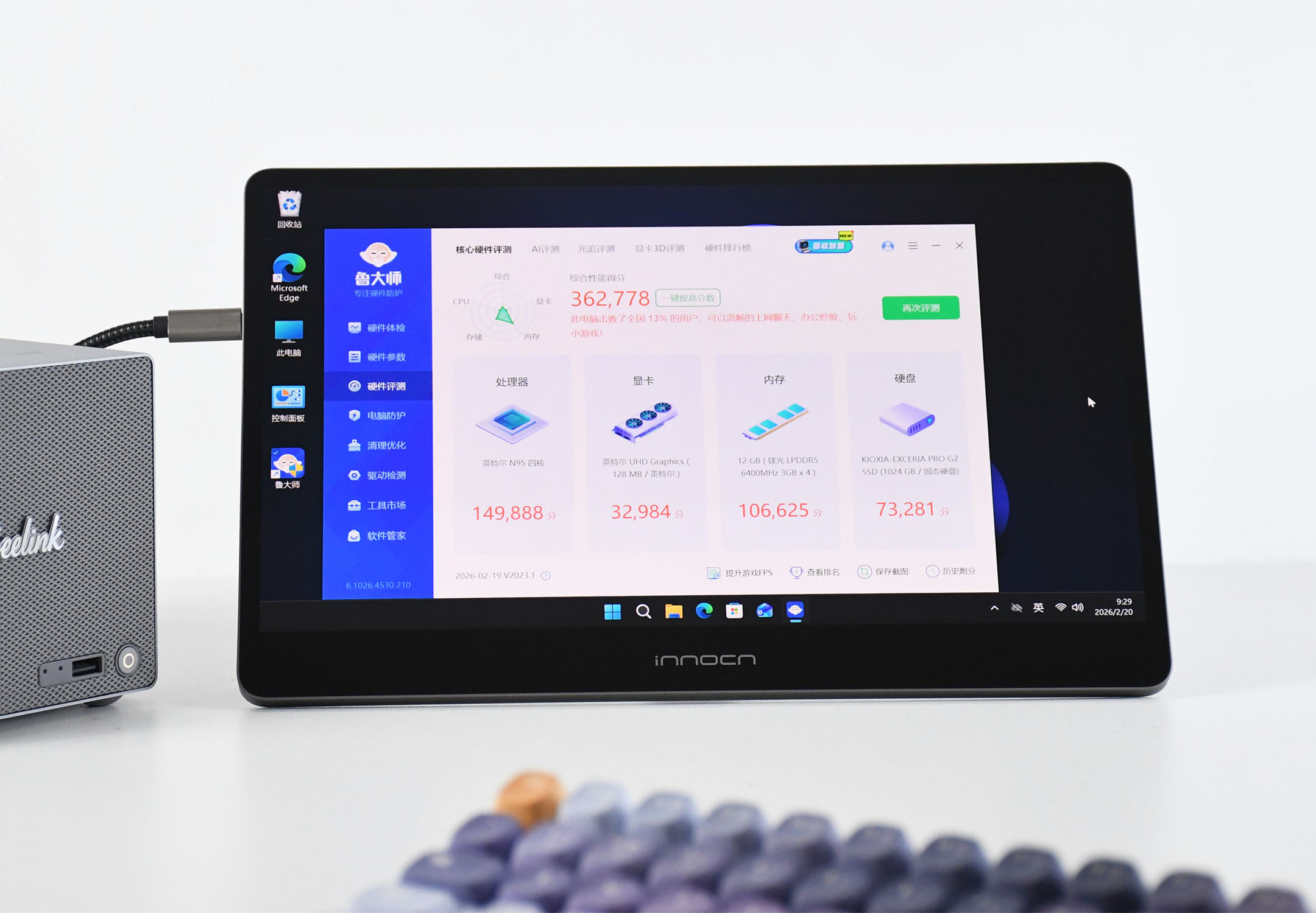 零刻ME Pro搭载的处理器为英特尔N95,我用鲁大师进行了下硬件评测,能看到成绩为36万分左右,其中处理器得分接近15万,显卡得分则为3万2左右,按照总成绩来讲,Windows系统下的零刻ME Pro用来轻办公以及轻度游戏问题不大。