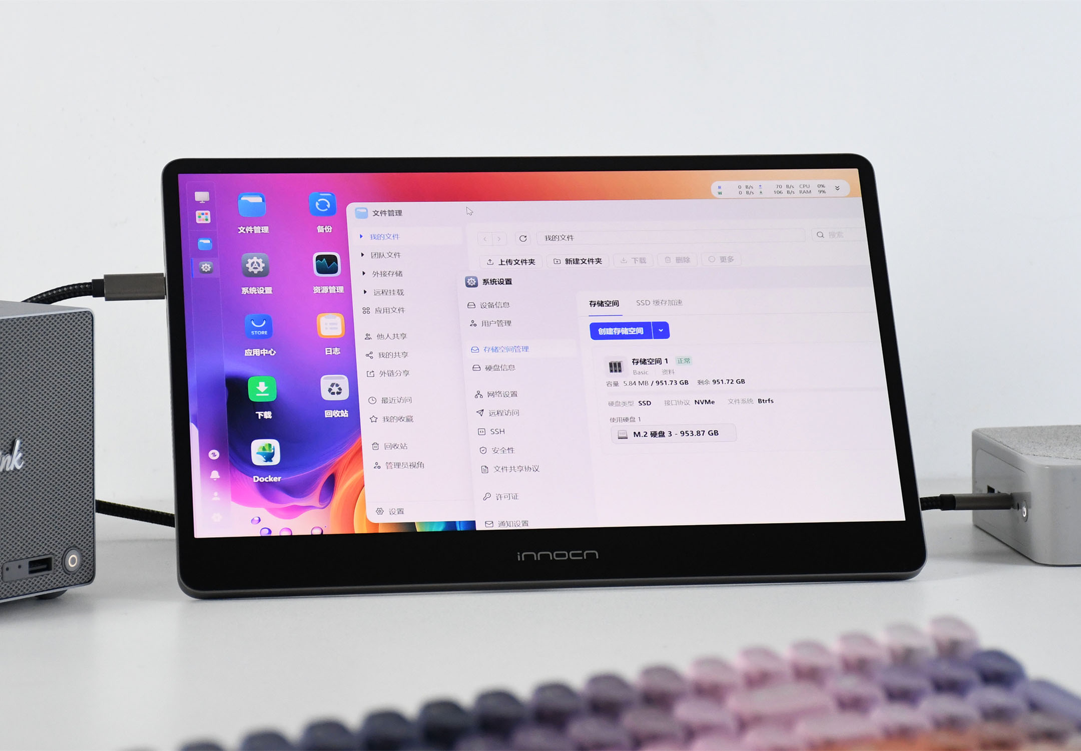 现在来说下零刻ME Pro的使用体验。由于进入飞牛fnOS后,零刻ME Pro是不会显示系统界面的,所以需要借助另外一台同网络下连接的PC、手机等,通过浏览器进入系统界面进行一系列的设置,例如,创建存储空间、下载应用等。