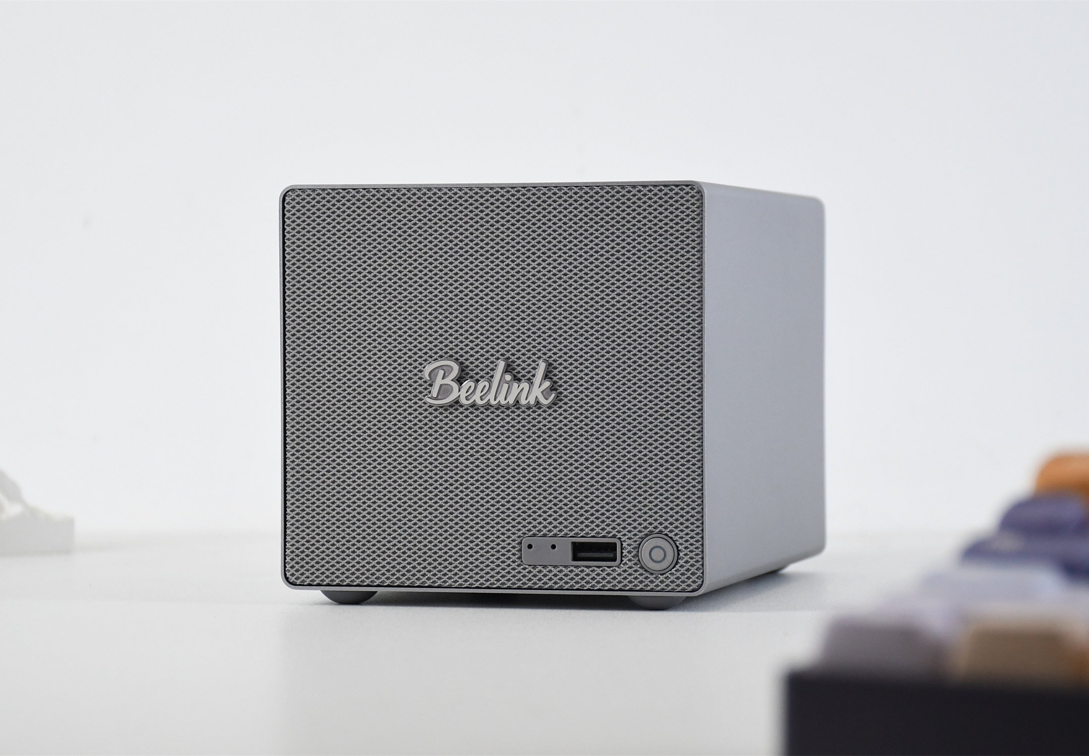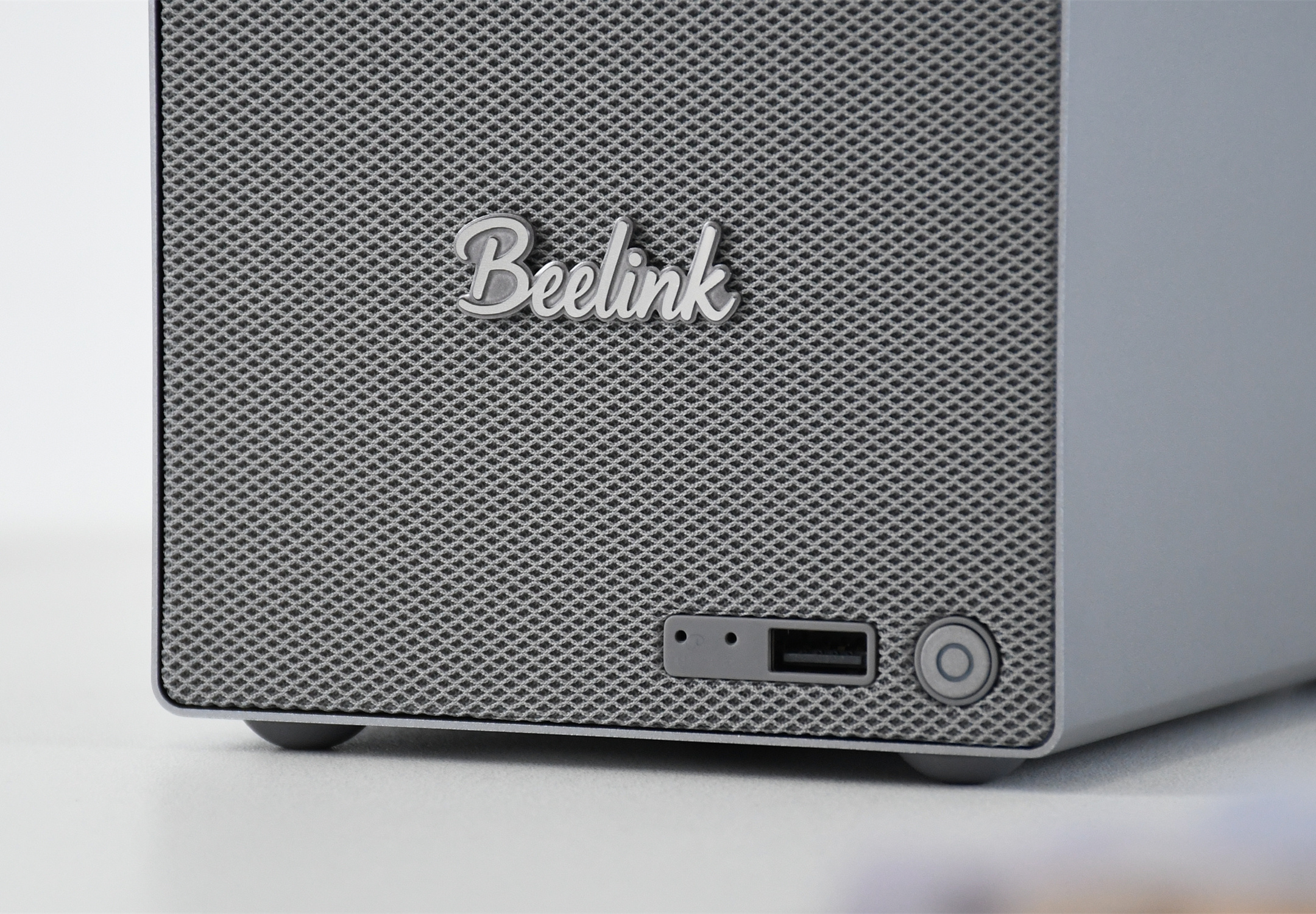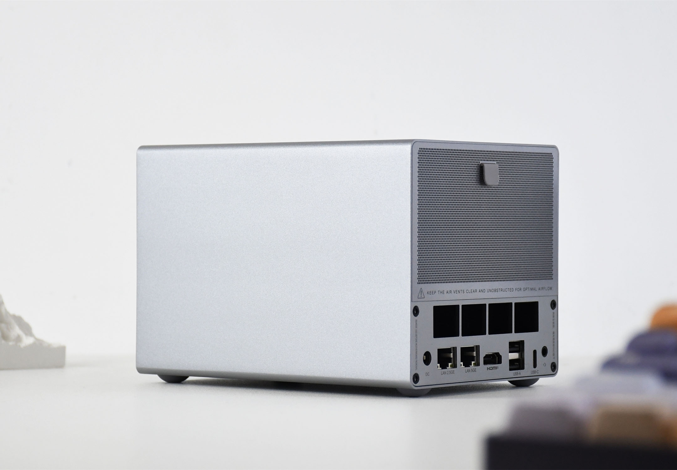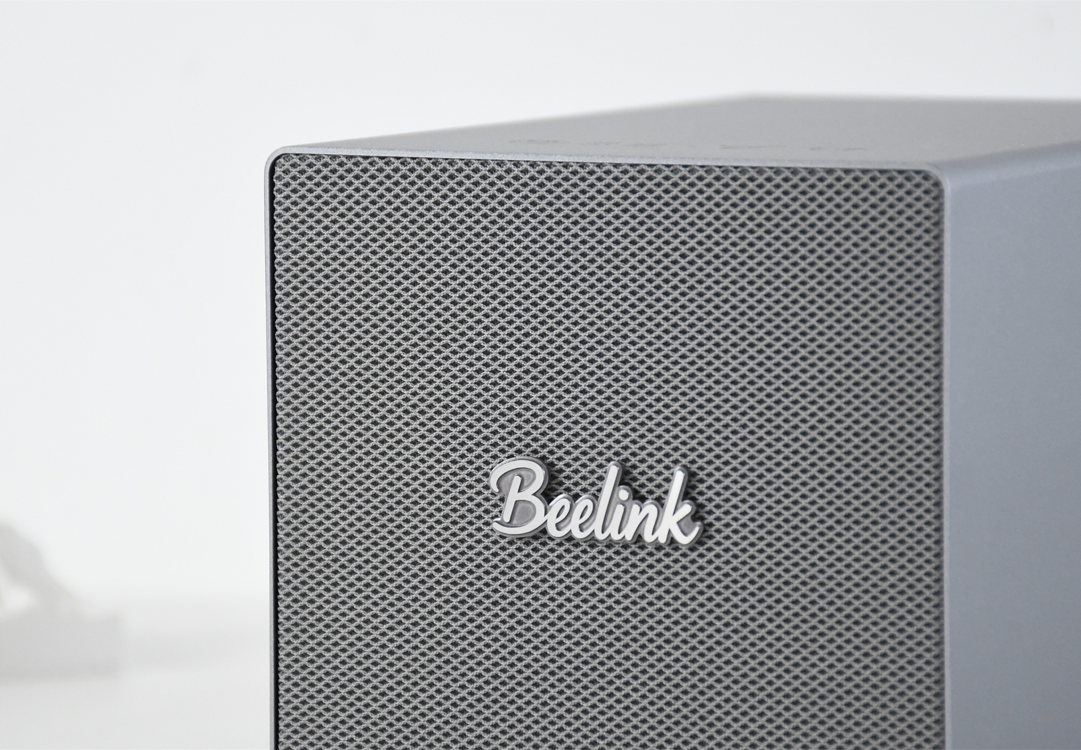 说实话,第一次接触到零刻ME Pro时,其外观给我一种“这确定不是音箱?”的错视感,机身“正脸”大面积的散热区域,确实有点像音箱的网罩,不得不说,这外观放在桌面上,确实比其他一些迷你主机或者NAS设备要“吸睛”。