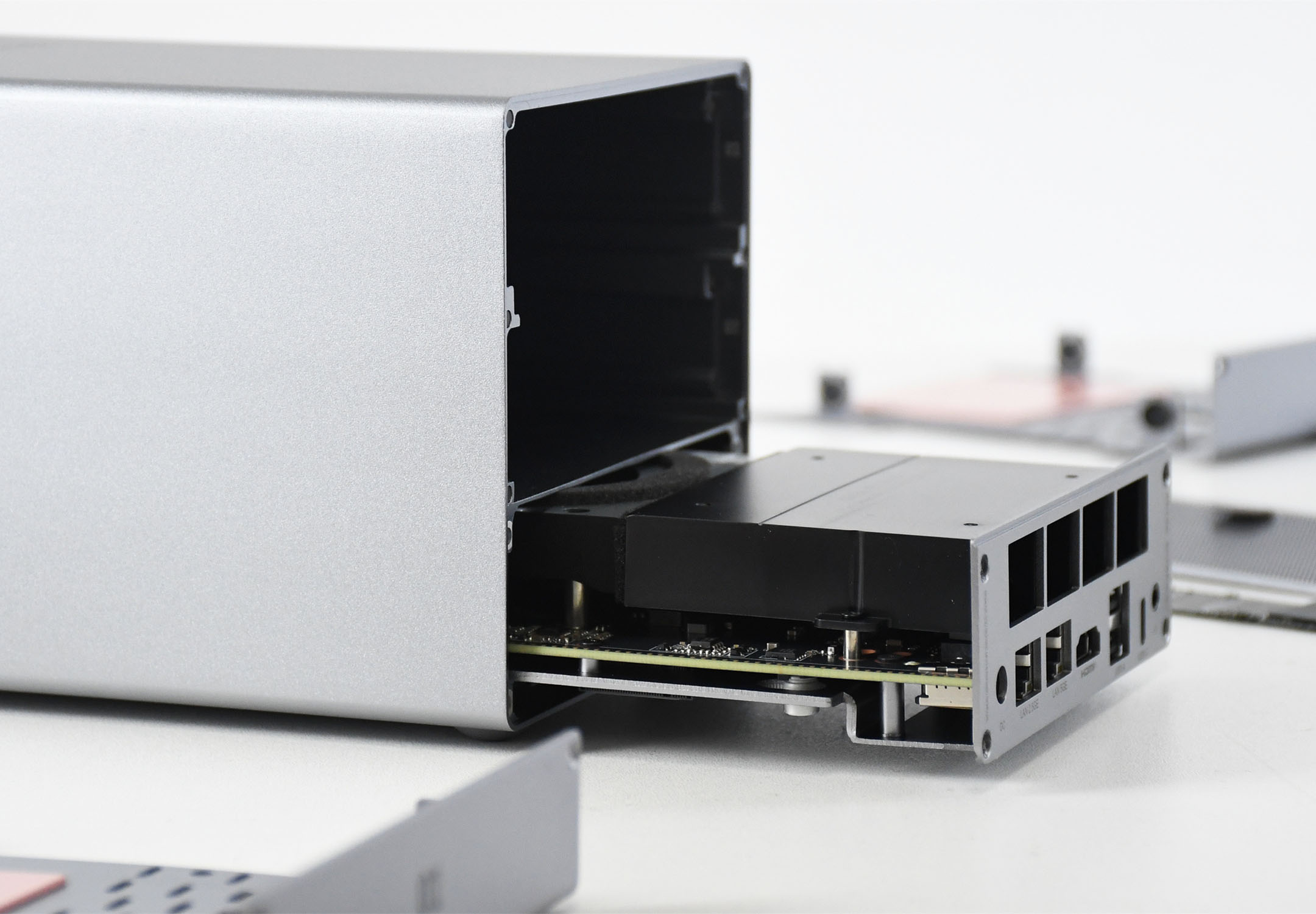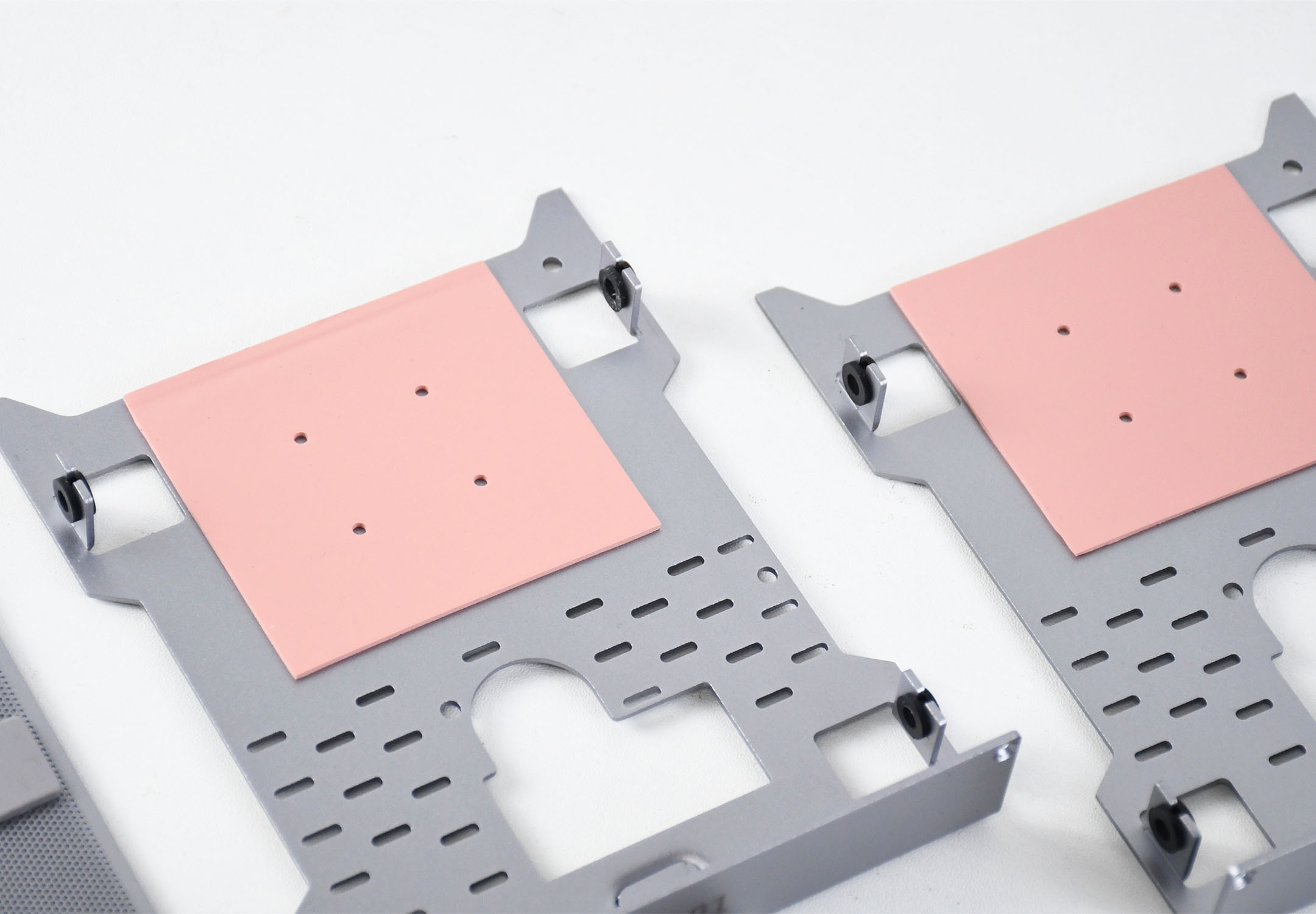 零刻ME Pro内部的两个机型硬盘支架均为铝合金材质,并且都预贴了导热硅胶,可以形成热处理导热,让硬盘保持在一个良好的温度下工作。