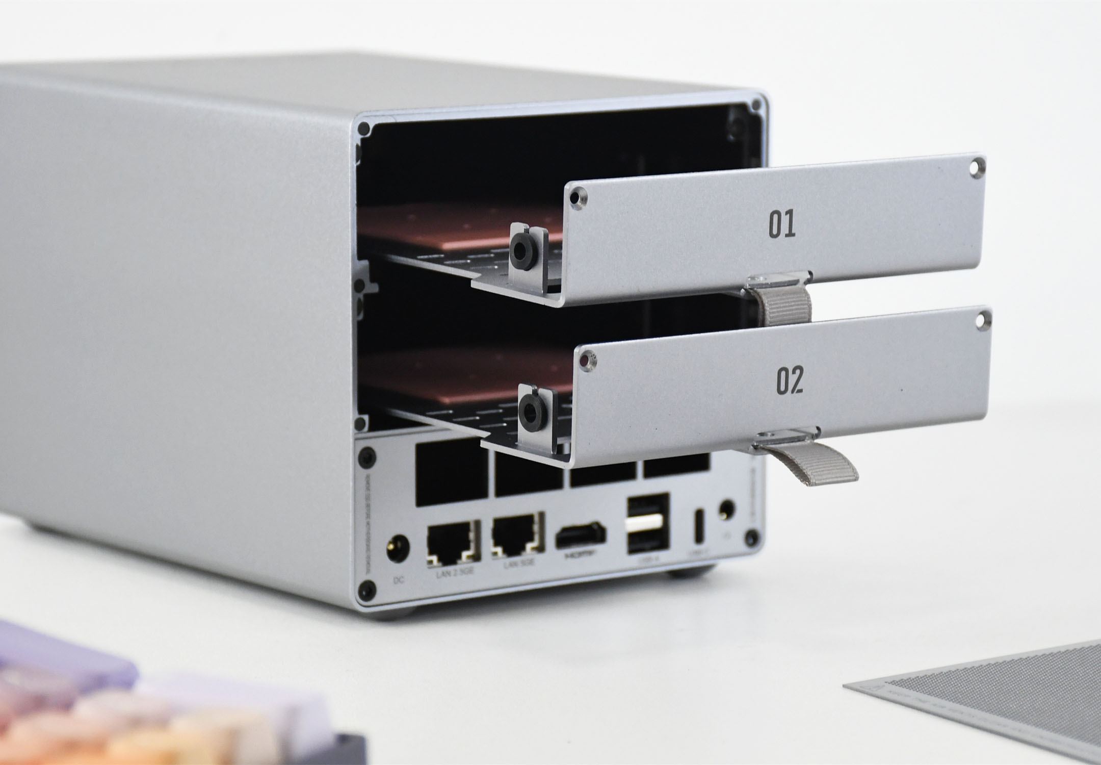 零刻ME Pro一共可以安装5块硬盘,取下背面的磁吸金属散热网罩后,就可以看到其中两个机械硬盘位。
