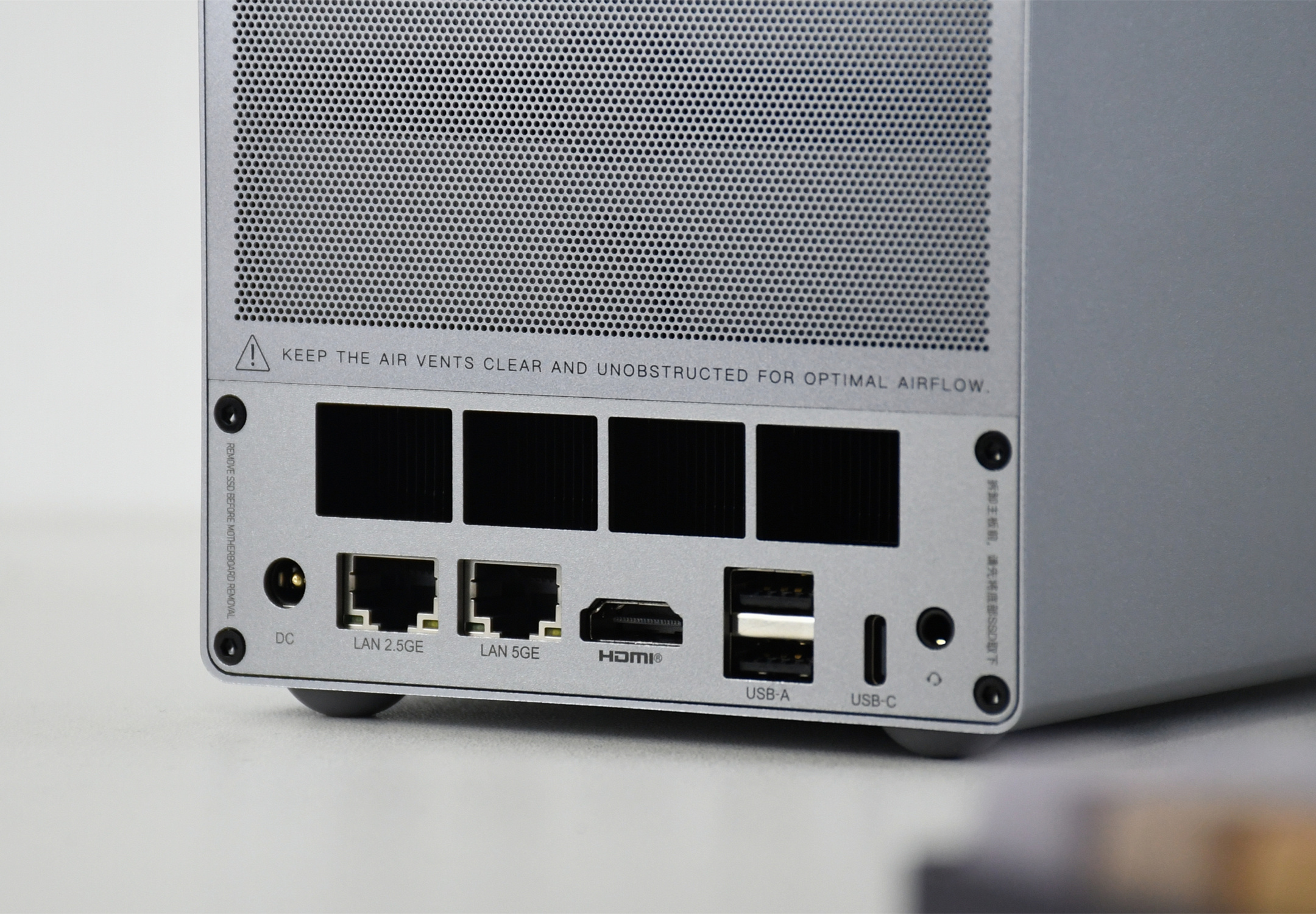 零刻ME Pro的接口也挺丰富,从左到右分别为:DC电源接口、LAN 2.5GE、LAN 5GE、HDMI、两个USB-A、USB-C以及3.5mm音频接口,其中USB-C接口是支持视频输出的,且可以使用“一线通”的方式跟便携屏连接。