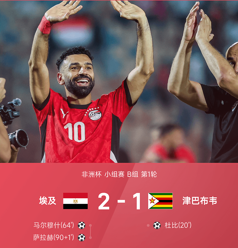 比赛进程远超预料,埃及队尽管占据压倒性优势,却在上半场率先丢球。最终凭借马尔穆什的爆射扳平,以及萨拉赫在补时第91分钟的绝杀,埃及队以2-1惊险逆转对手,拿下小组赛开门红。
