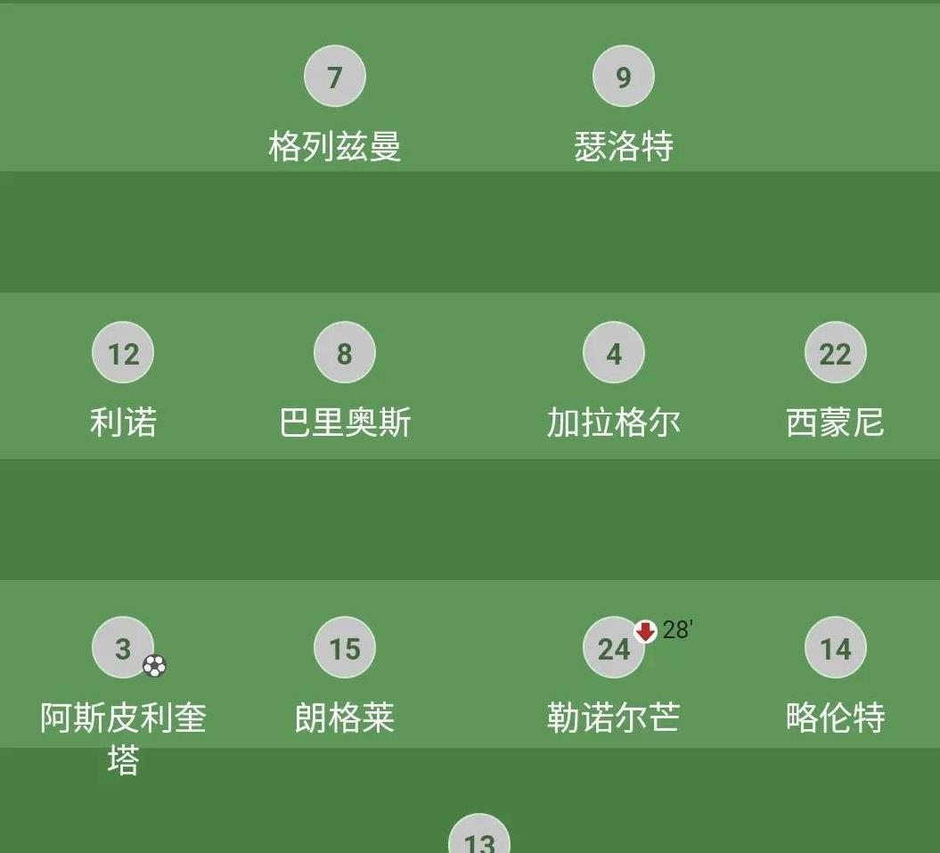 马竞4-4-2强阵出击马竞这次排出了4-4-2的阵型,格列兹曼和瑟洛特搭档前锋,冲锋陷阵!中场是西蒙尼带着加拉格尔、巴里奥斯和利诺一起上场,后防线上是略伦特、勒诺尔芒、朗格莱和阿斯皮利奎塔,奥布拉克守门!那个小蜘蛛阿尔瓦雷斯在替补席待命呢!