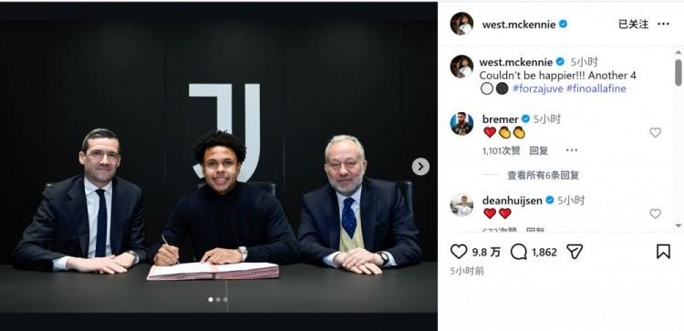 官宣续约后,麦肯尼在社媒上发文:“你们好,所有的尤文球迷们,我很高兴能够延长我的合同,并与你们共度更多的时光。我们球场上见!”