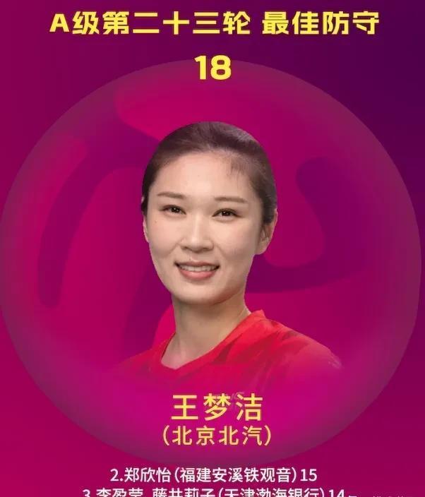 最佳防守作为国家队主力自由人,效力于北京女排的王梦洁再度展现防守实力,贡献18次成功防守,她的稳定发挥成为北京队获胜的重要支柱。福建女排郑欣怡15次排在第二。天津女排李盈莹和藤井莉子均以14次排名本轮第三。