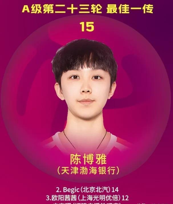 最佳一传本轮天津队的陈博雅在一传环节发挥稳定,她的15次成功一传为球队的进攻组织奠定了良好基础,尽管球队惜败,但她的表现仍然十分亮眼。