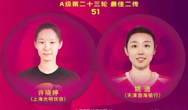 最佳二传本轮比赛,天津女排姚迪与上海女排许晓婷双双斩获51次有效二传,并列最佳二传,两位二传的精准调配,使得各自队伍的进攻能够充分展开,展现出极高的战术执行力。