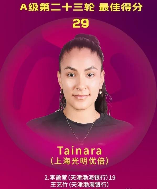 最佳得分泰纳拉本轮比赛火力全开,豪取29分,成为本轮最佳得分手,她的全面发挥助力上海队在关键比赛中险胜天津,打破了对手的13连胜。李盈莹、王艺竹、贝吉奇三人均以19分排在第二。