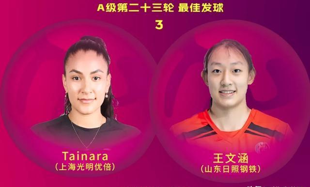 最佳发球本轮泰纳拉不仅在进攻端无懈可击,发球环节同样表现出色,她的发球威胁性极大,为上海队创造了更多机会,她与山东队的王文涵3个ACE球并列最佳发球榜首。