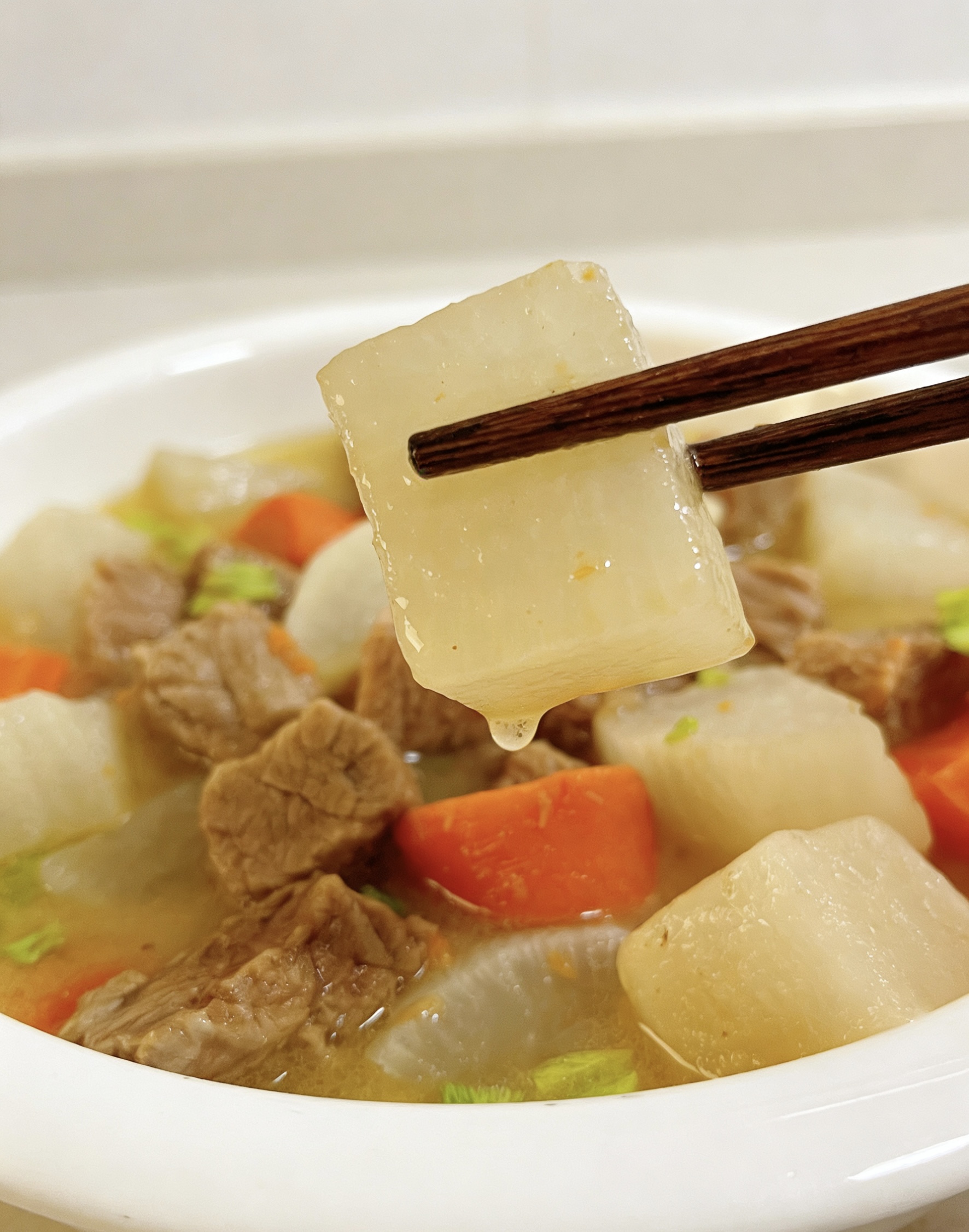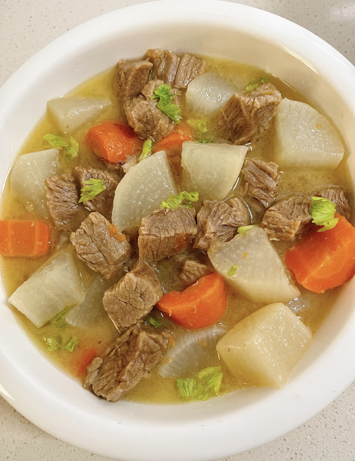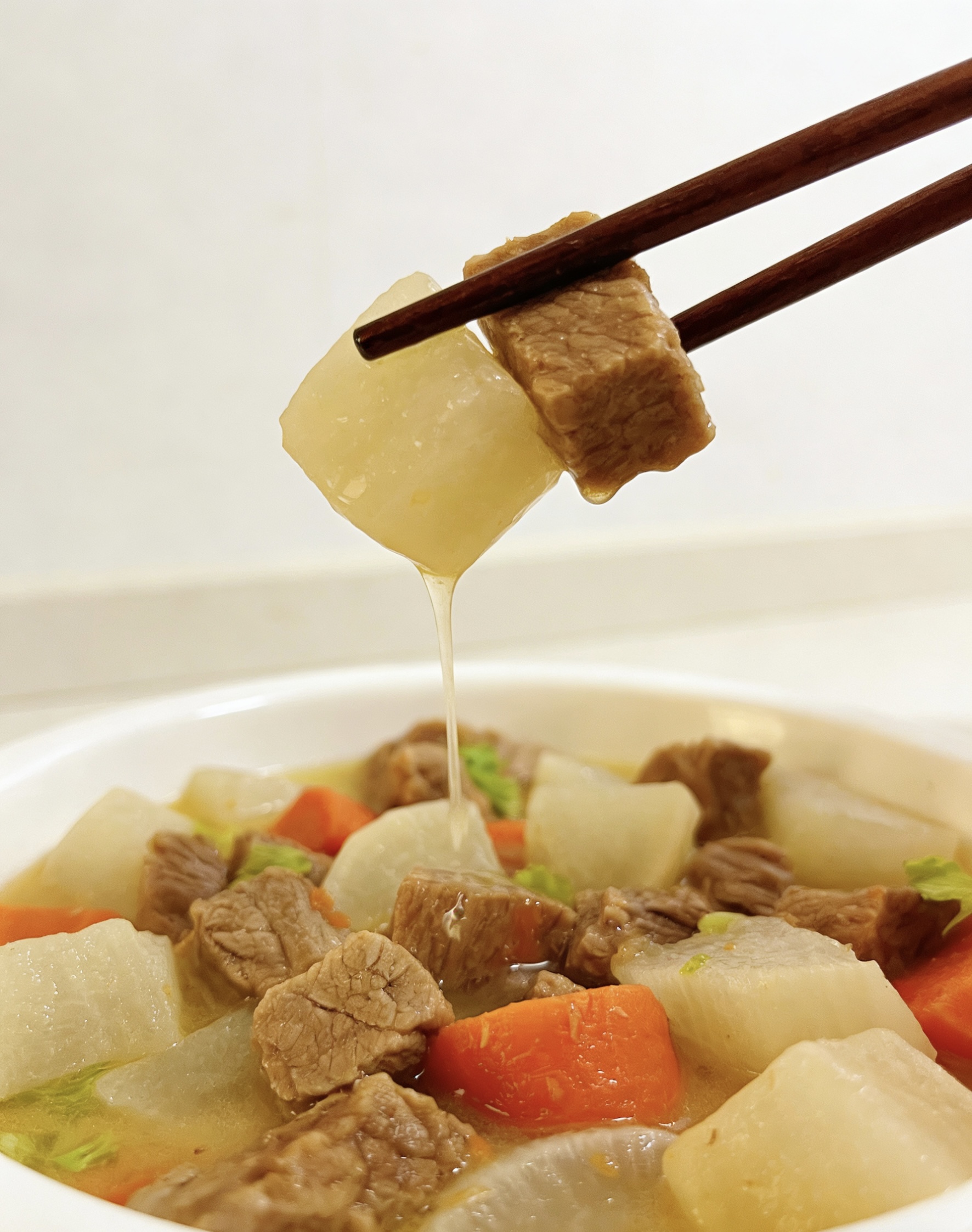 端上桌之前,记得提前焖一锅米饭,牛肉炖萝卜的汤汁是“饭扫光”级别的核武器。先舀一勺汤,吹一吹,入口先是八角桂皮的小暖风,紧接着牛肉的醇厚像厚毛毯裹住舌尖,萝卜的清甜最后跳出来漱口,三层味道像俄罗斯套娃。夹一块牛肉,纤维里吸饱汤汁,轻咬即断,却还带着一点筋膜的弹;萝卜更是神奇,外表保持形状,内里早已化成绵密甜沙,一抿就化,只留下满口鲜甜。