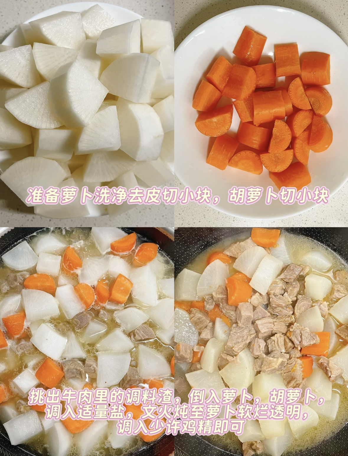 趁牛肉在篮子里滴水,咱们给萝卜开会。白萝卜选掂起来沉甸甸、表皮光滑没黑点、尾巴不糠的,胡萝卜就当调色盘,切滚刀块,大小和牛肉差不多,这样它们才能在锅里“同步软”。很多人问要不要先炒萝卜?NO,萝卜生性纯洁,提前见油会发苦,让它直接跳进肉汤里“泡澡”才甜。