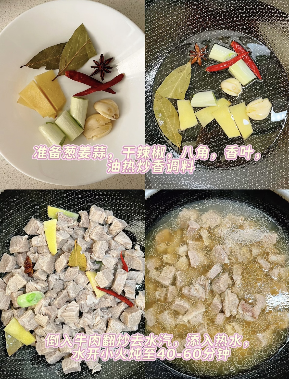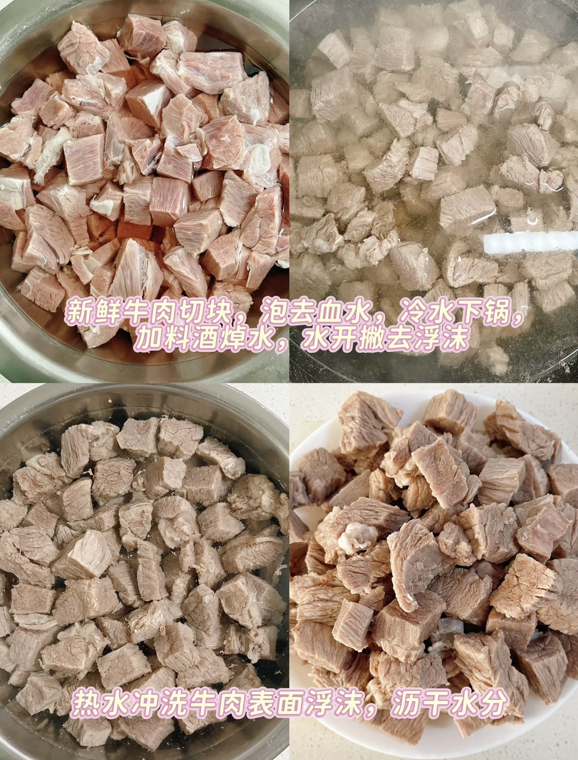 先说选肉,牛腩和牛腱子是一对性格迥异的姐妹花。牛腩肥瘦交错,炖完像会流油的棉花糖;牛腱子筋肉分明,口感弹牙,适合喜欢“嚼着香”的牙口党。菜市场里跟老板说一句“炖萝卜用”,他立马手起刀落给你切成3-4厘米的小方块,省得回家案板剁得咚咚响。拿回家别急着下锅,先给牛肉泡个冷水SPA,十分钟换一次水,泡到没有血水脸红为止,这一步是去腥关键,偷懒的话,后面放再多料酒都救不回来。