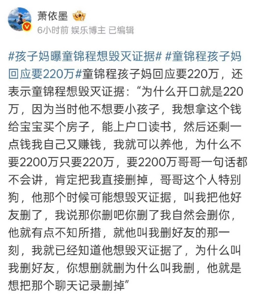 可冷静下来的萧依墨想到,童锦程身边向来异性环绕,未来若组建新的家庭,自己的孩子很可能会被彻底忽视,于是她提出了新的诉求,要求童锦程一次性支付18年的抚养费共计220万元,其中包含了孩子的生活费和自己生育的医疗费。