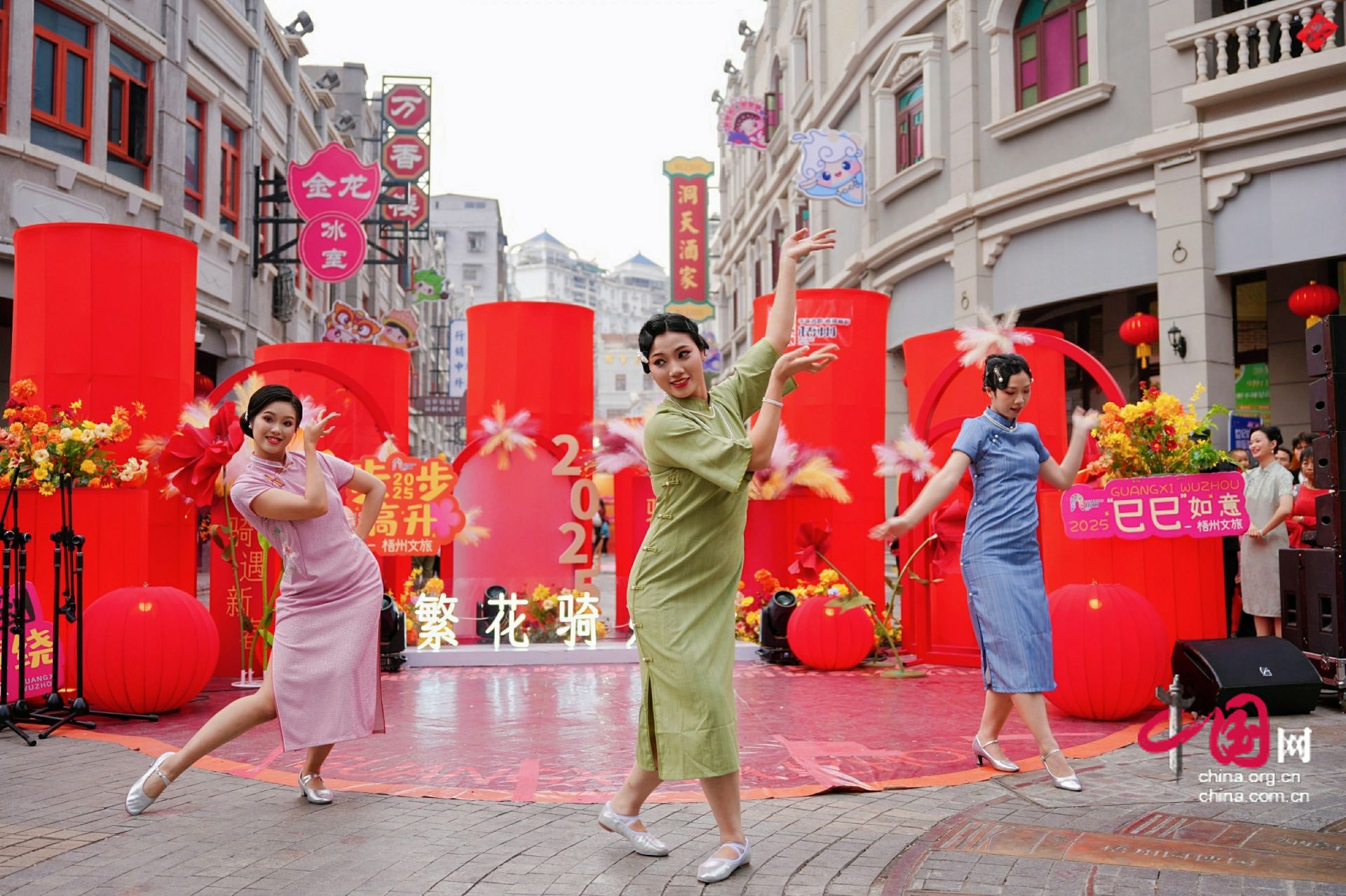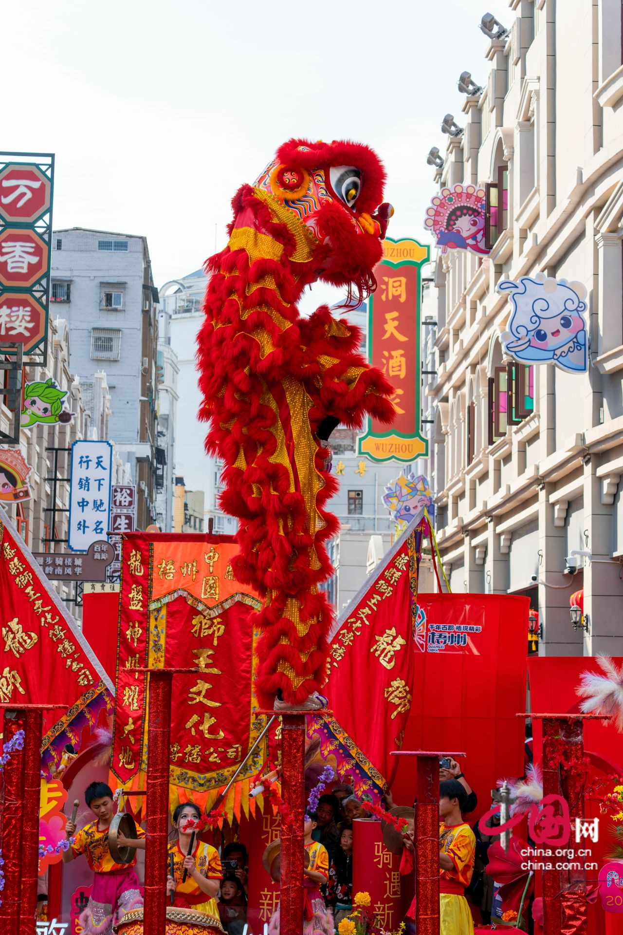 中国网2月5日讯 (记者 杨俊康)新春佳节,广西梧州的骑楼城在节日的气氛中焕发出新的生机。广西(梧州)岭南风情文化旅游季暨“梧现精彩”文体旅促消费系列活动在此举办,现场通过传统龙狮贺岁表演、“恭喜花彩”街头艺术展、城市漫邮生活节、新春车尾箱集市、骑楼歌会等充满迎新氛围的新年活动,尽显“岭南年味”的独特魅力。市民和游客纷纷涌入骑楼城,以花为景,以城为趣,沉浸式体验南国新春里的“梧现精彩”。
