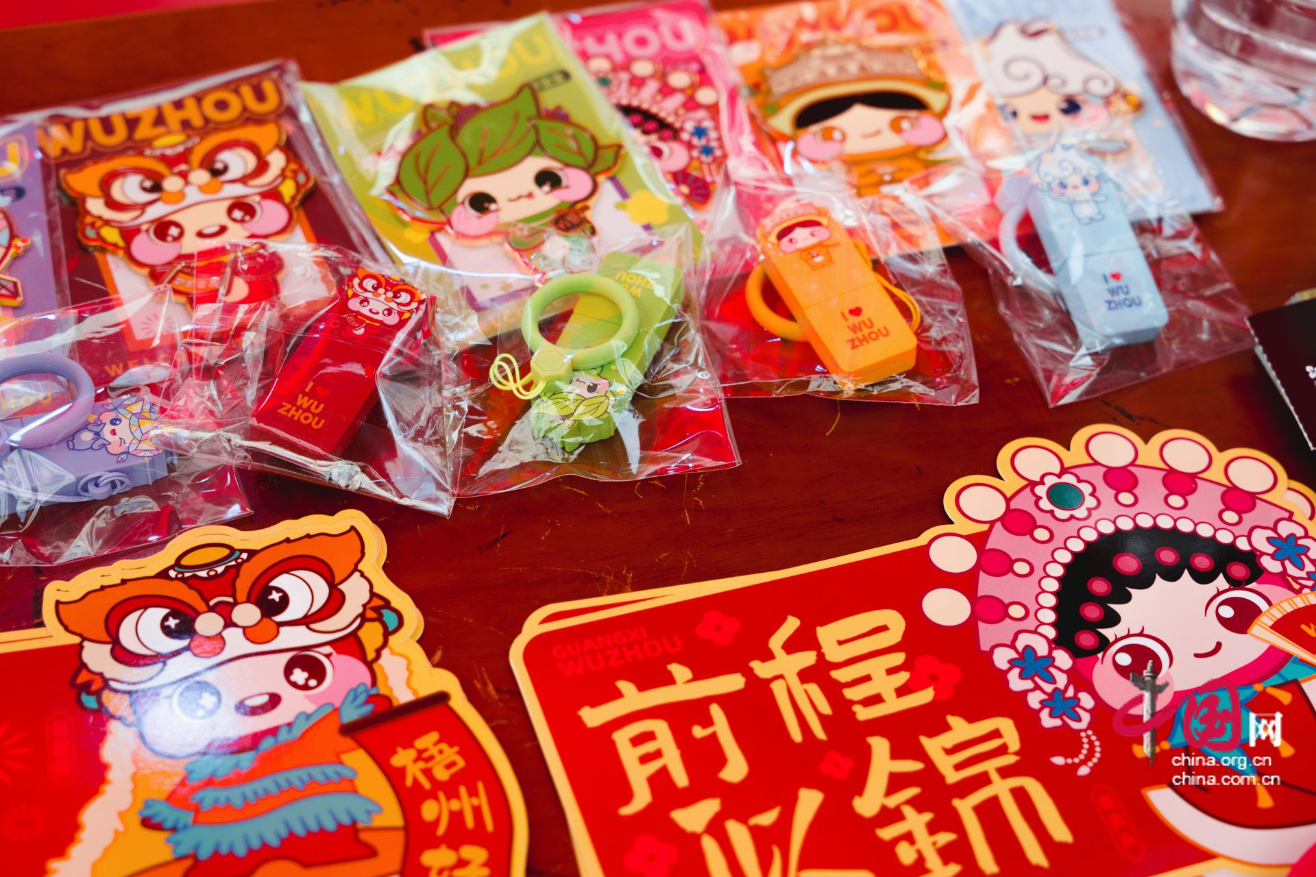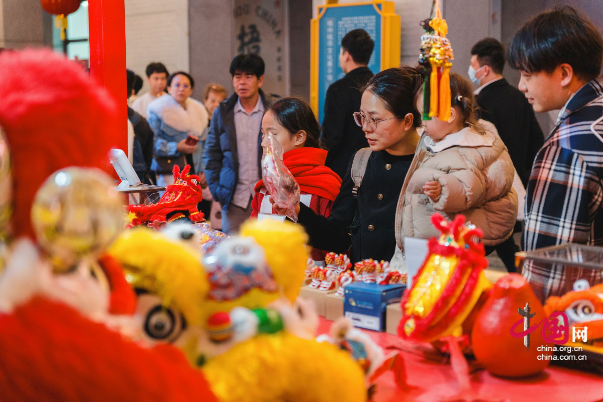 新春市集上,琳琅满目的年花和非遗文创工艺品吸引了众多目光。醒狮文创、壮锦围巾、绣球挂饰、苗族银饰、铜鼓摆件……每一件工艺品都承载着匠人的匠心与非遗文化的独特魅力。值得一提的是,梧州醒狮文化源远流长,藤县作为“舞狮之乡”,其狮舞文化已有千年历史。藤县醒狮以其高难度的动作和精湛的技艺闻名中外。伴随着热烈的龙狮锣鼓声,游客们在非遗文创摊位前驻足流连,欣赏于精美的工艺品,也留住了梧州文化的记忆与温度。