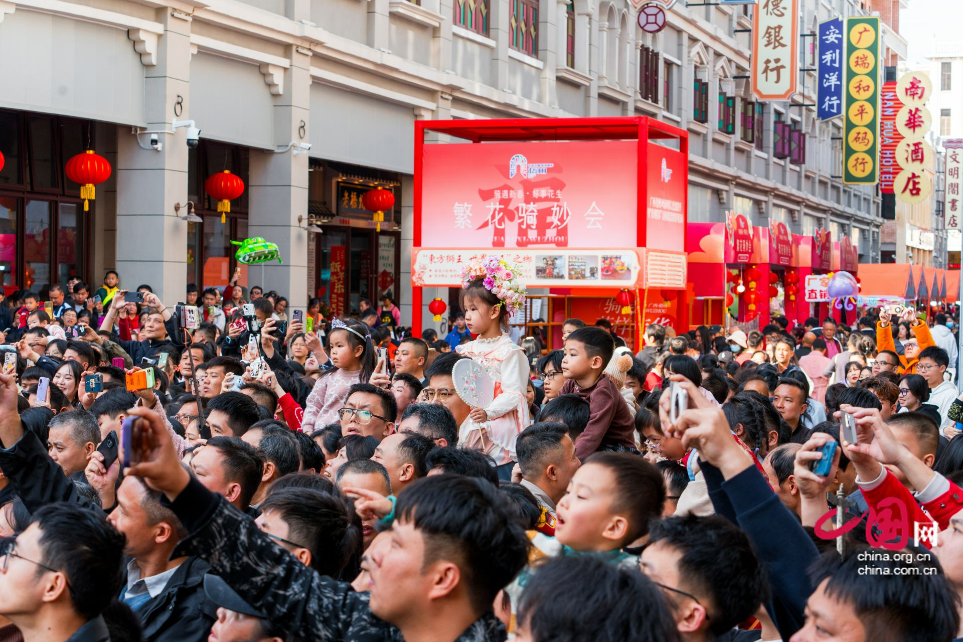春节漫步于骑楼城的街头巷尾,传统佳节的热闹喜庆与非遗文化的深厚韵味相交织。不少游客头戴簪花身着汉服,穿梭于骑楼城的古街老巷中。梧州素有“行花街,走大运”的传统风俗,今年的繁花骑妙会特别设置了“看花秀”和“行花街”活动,让人们在花海中感受新春的喜悦。游客在繁花艺术打卡装置前拍照留念,欢声笑语间仿佛将整个春天的美好都定格在了这一刻。
