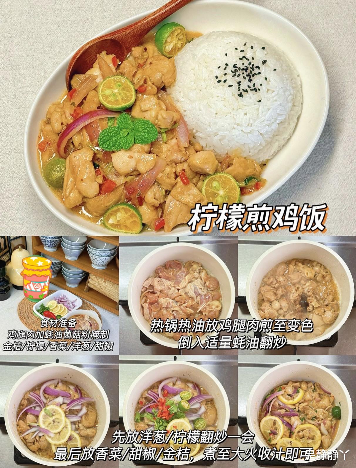 周四来点不一样的,做柠檬煎鸡饭。鸡腿肉切块,用蚝油、菌菇粉腌制,煎到变色后加点蚝油翻炒,再放洋葱和柠檬片,炒出香味后加水焖煮。最后放香菜、甜椒和金桔,大火收汁,酸甜开胃的味道瞬间弥漫整个厨房。柠檬的清香中和了鸡肉的油腻,金桔的甜味让整道菜更有层次,孩子吃的时候会说“妈妈,这个鸡有水果味”,连平时不爱吃酸的孩子都能吃上两碗饭。