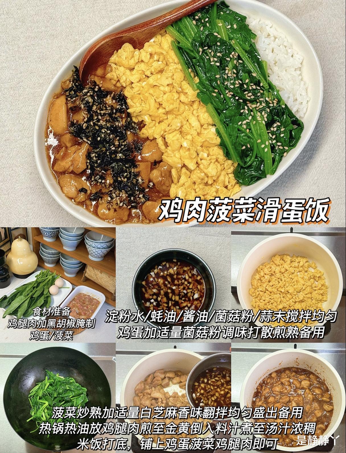 周三的晚餐是鸡肉菠菜滑蛋饭。鸡腿肉去骨切块,加点黑胡椒腌制,煎到金黄;鸡蛋打散,加少许盐和菌菇粉调味,煎成滑嫩的蛋块。菠菜炒熟,加点白芝麻提香,和鸡蛋、鸡肉一起铺在米饭上。这道菜颜色丰富,绿油油的菠菜、金黄的鸡蛋、嫩滑的鸡肉,看着就有食欲。菠菜富含铁和纤维,鸡蛋提供优质蛋白,鸡肉低脂高蛋白,营养搭配很均衡,孩子吃着健康,妈妈也放心。