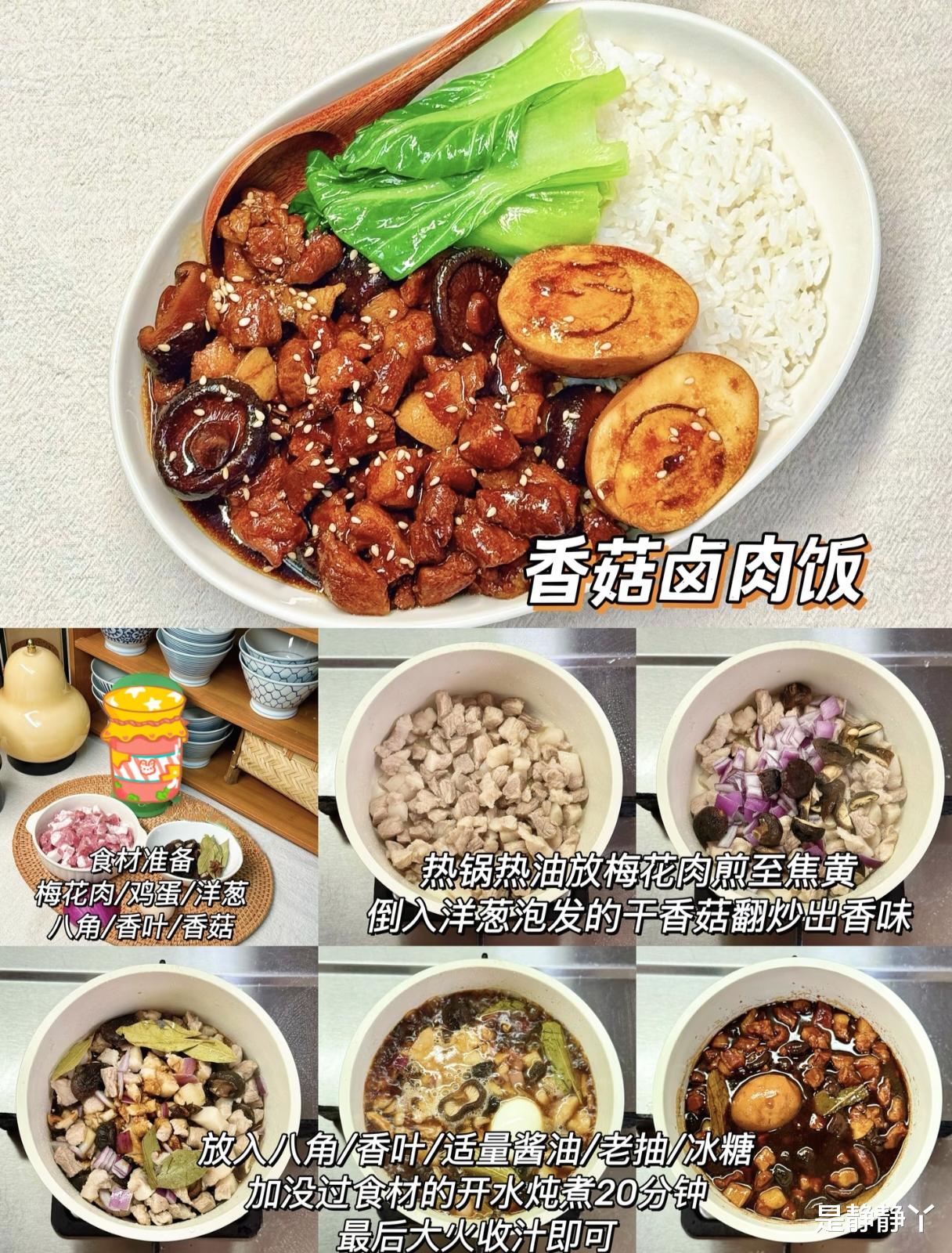 周一的晚餐,从一碗热腾腾的香菇卤肉饭开始。梅花肉切成小块,煎到焦黄,再和泡发好的干香菇一起翻炒,香味瞬间扑鼻。加入八角、香叶、酱油、老抽和冰糖,倒上没过食材的开水,小火慢炖二十分钟,最后大火收汁,肉块裹着浓稠的酱汁,配上软糯的米饭,再加两颗卤蛋和几片青菜,孩子吃一口就停不下来。这道菜的关键是肉要选带点肥的梅花肉,炖出来才香而不腻,香菇的鲜味渗进肉里,比外面买的卤肉饭还香。