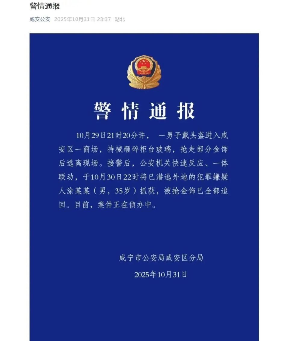 10月31日凌晨,咸宁咸安公安发布警情通报:将涂某某抓获,被抢金饰已全部追回。