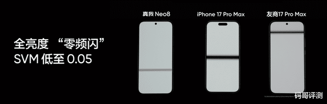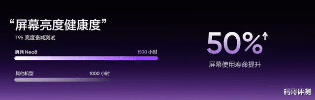在亮度方面,真我Neo8实现手动最高1000nit、全局峰值1800nit、局部峰值6500nit以及阳光显示3800nit的全场景顶级通透体验,阳光显示状态下103% P3超广色域让色彩还原更准确,高亮不再惨白。新发光材料更带来了更耐久的发光寿命,真我Neo8采用更严苛的T95亮度衰减指标,实测成绩长达1500小时,屏幕寿命较行业提升50%。护眼方面支持全新绿野护眼方案,支持全亮度DC调光,SVM低至0.05,并获得了莱茵无频闪认证,硬件级低蓝光与AI护眼功能,全场景守护用眼健康,让久玩更护眼。