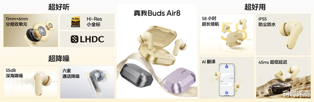 发布会上,真我Buds Air8同步亮相。其外观设计灵感源于对自然的向往,从金色麦田、紫色薰衣草、灰色鹅卵石中提取原色,打造大师金、大师紫、大师灰三款配色,充电仓顶面采用素皮材质搭配金属喷漆。音质方面,配备旗舰级11mm+6mm分频双单元,低音澎湃有力、高音清亮通透,支持LHDC 5.0高清传输与Hi-Res小金标认证。降噪方面配备55dB深海级降噪,降噪频宽高达5000Hz,无论轰鸣的飞机还是嘈杂的地铁,世界瞬间安静,喧嚣秒变深海。同时支持耳道自适应降噪,根据耳道结构定制降噪曲线,配合六麦通话降噪,闹市通话也字字清晰。