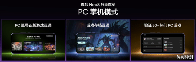 真我Neo8更带来行业首发PC掌机模式,让手机不再只是手机,更是随身携带的PC游戏掌机。PC掌机模式实现Steam账号正版游戏互通与游戏存档互通,已验证可流畅运行超50款热门PC游戏,打破了移动游戏与PC游戏的次元壁。