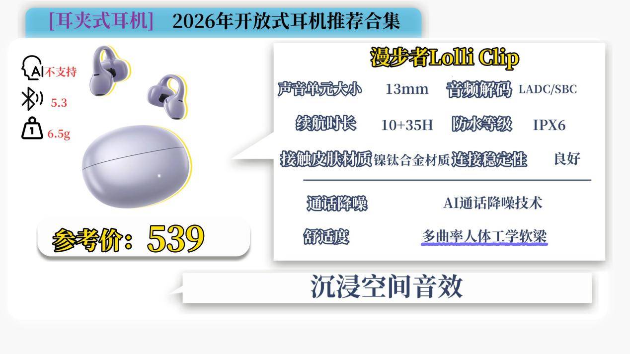 漫步者Lolli Clip配备EDIFIER专利多曲率空气弧仿生结构,设配不同耳廓,强韧镍钛骨架+柔性硅胶外层,单只耳机重量仅6.5g,日常佩戴没什么问题。音质上配备13mm大尺寸镀钛动圈单元,声音更加开阔自然。配置上支持蓝牙6.1,更快、更稳、更省电,在信号复杂的环境,连接稳定出色。