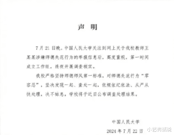 不过,中国人民大学最后一句话明确表示:学校将于近日公布调查处理结果!