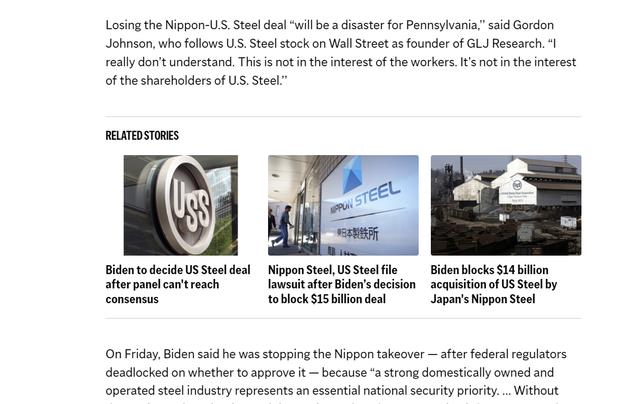 周五,拜登表示,他将停止对 Nippon 的收购——在联邦监管机构在是否批准它的问题上陷入僵局——因为“强大的国内拥有和经营的钢铁行业代表了重要的国家安全优先事项。...没有国内钢铁生产和国内钢铁工人,我们的国家就会不那么强大,也就不那么安全。