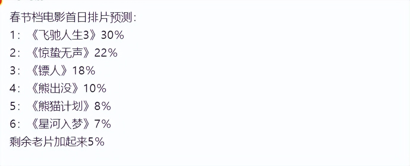 当6部电影都选择定档“春节档”的时候,官方对它们的首日排片进行预测,大家都知道,春节档的排片率非常重要,因为只有高排片,才能够创造出更高的票房。