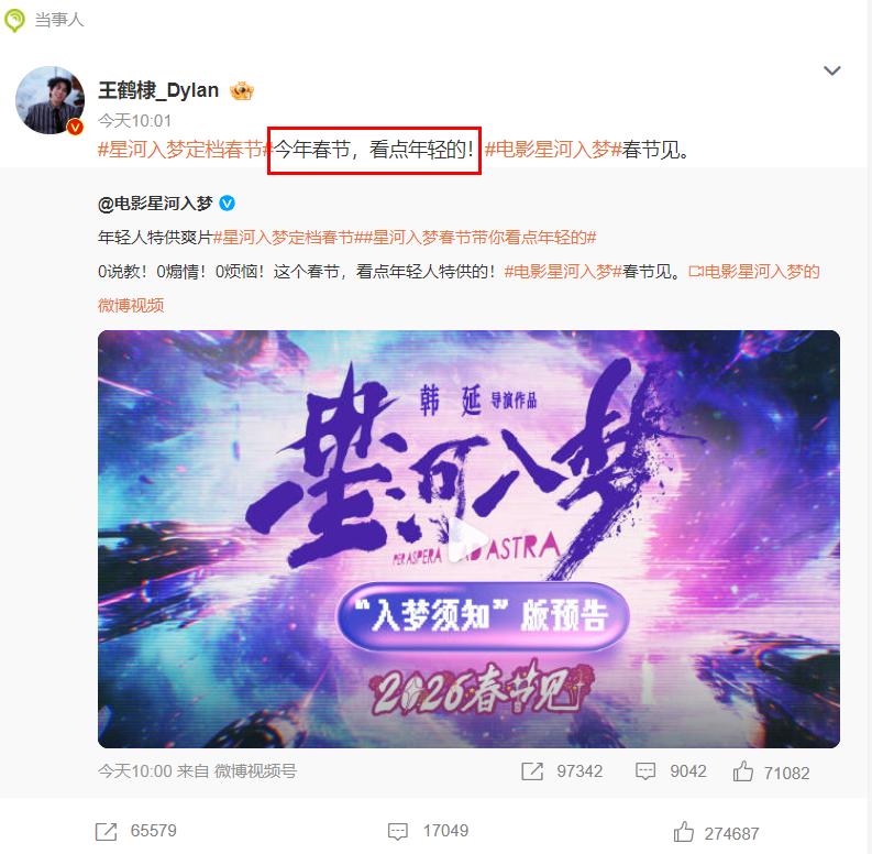 《星河入梦》之后,这部电影开始宣传,让大家没想到的是,这部电影竟选择走“年轻人”路线,王鹤棣和宋茜的文案都是“今年春节,看点年轻的”,官方给出的是“年轻人特供爽片”,也就是说,这个电影想要占领年轻人市场。